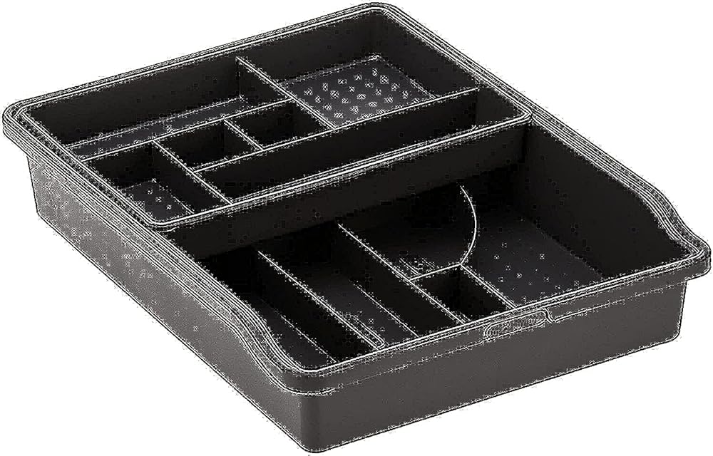 Maximize the space in your drawers with the Madesmart Original Junk Drawer Organizer. Simple and convenient, this multipurpose organizer tray offers a practical solution for neatly storing just about anything in your junk drawers, bathroom drawers, kitchen drawers, or office drawers, keeping items organized and easily accessible. Designed with 23 compartments of various shapes and sizes, the tray makes it easy to create your own personalized organizational system to fit in any drawer throughout your home. It's perfect for organizing a variety of items such as school or office supplies, crafts, makeup, coins, kitchen gadgets, small tools, and other miscellaneous objects throughout your home. The smaller sliding top tray easily moves from side to side over the larger bottom tray, and both trays feature branded icons to make organizing easier and more efficient. Made from durable BPA-free plastic, the low-profile bin withstands daily use and provides years of quality drawer organization. The storage tray measures 15.1" x 11" x 3" (38.25 cm. x 29.21 cm. x 7.62 cm.) to offer plenty of space for your drawer storage needs.