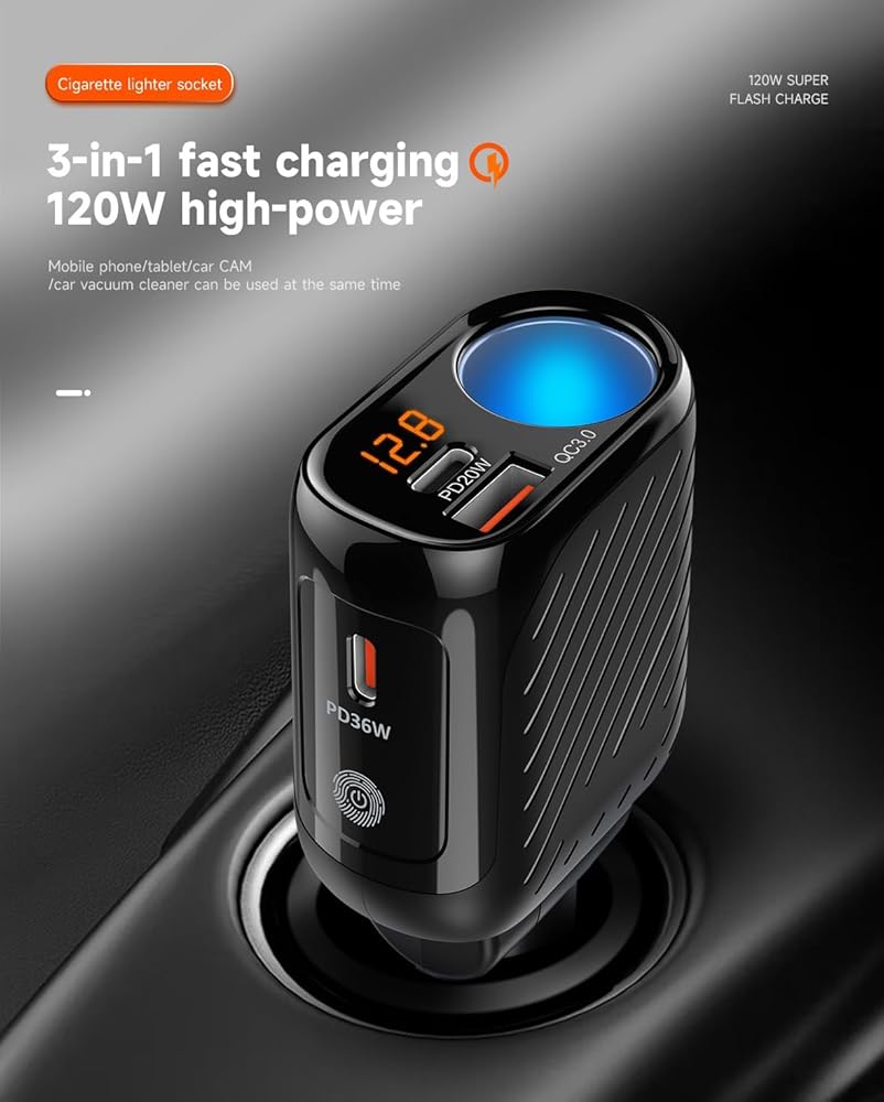 شاحن سيارة بمقبس واحد ومآخذ ولاعة سجائر USB مزدوجة - ثلاثة مقابس تلبي ما يكفي لنظام تحديد المواقع العالمي (GPS) وكاميرا داش والاستخدام المتزامن لمجموعة متنوعة من الأجهزة المحمولة في سيارتك 12 فولت/24 فولت. (ملاحظة: يستخدم فقط في الأجهزة ذات الطاقة الإجمالية 150 وات)