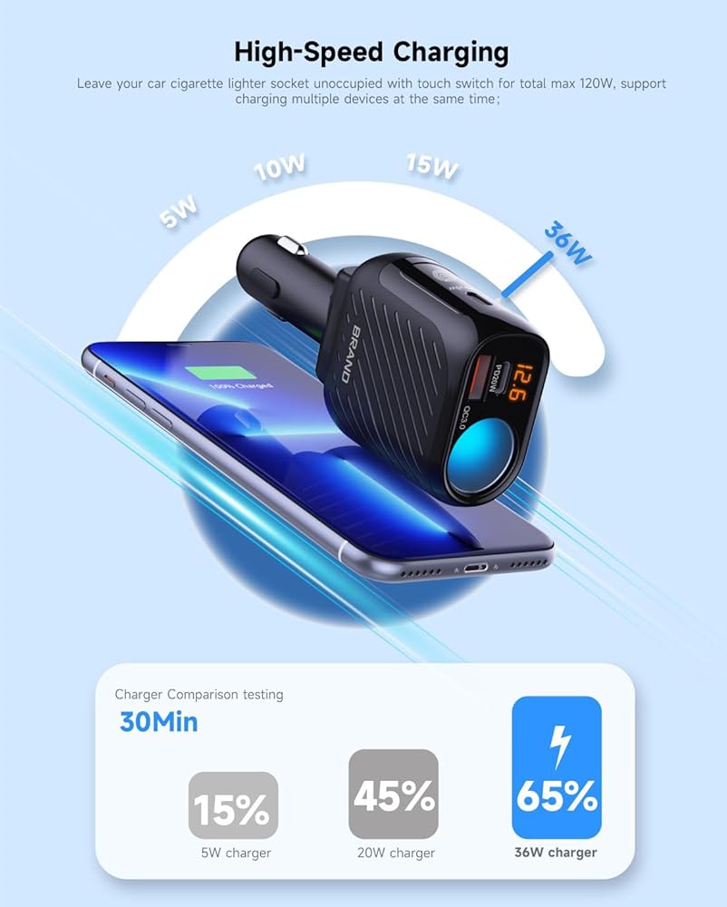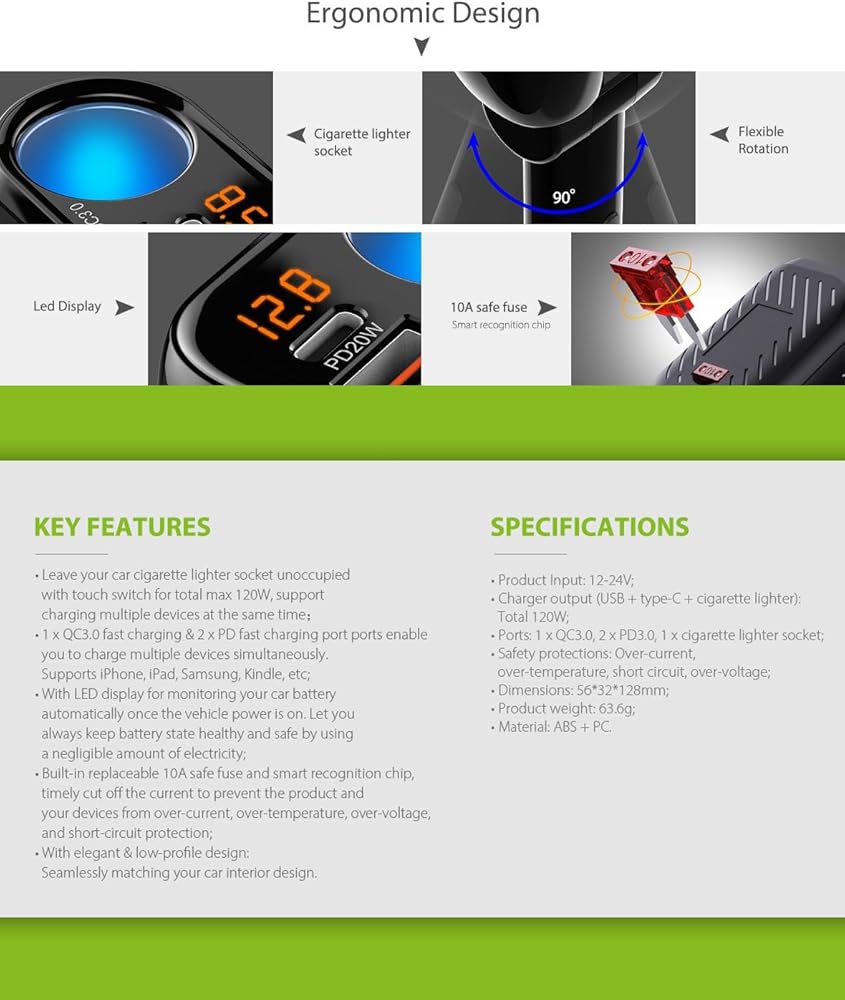 نظام أمان متعدد الحماية وكابل طويل - صمام أمان مدمج ورقاقة التعرف الذكية تمنع من التيار الزائد والجهد الزائد وحماية الدائرة القصيرة، مما يضمن الحماية الكاملة لك ولأجهزتك. سلك تمديد بطول 2.3 قدم يجعله مناسبًا لعائلتك وأصدقائك في المقعد الخلفي