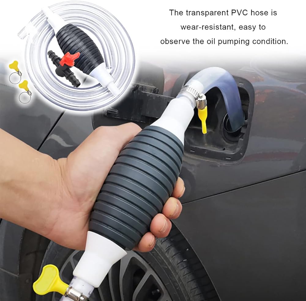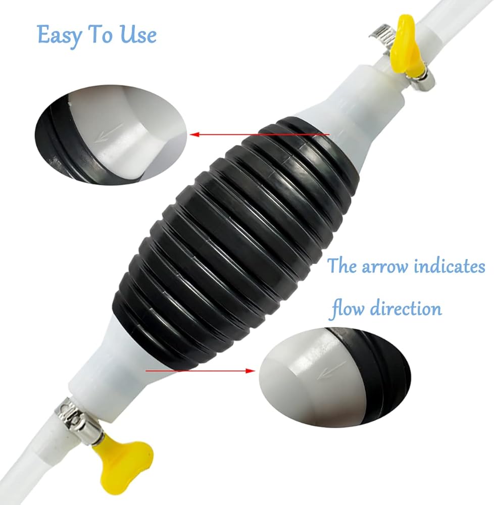 Quick start rubber hand pump for siphoning liquid flow. The long and thick transparent PVC hose is resistant to oil and high temperature. It comes with two yellow fittings that increase the hose and ball pump seal to prevent side leakage.