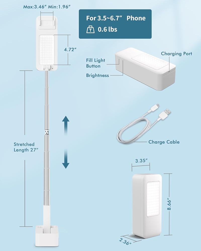 حامل هاتف Viozon قابل للتمديد، حامل علوي، ضوء سيلفي، دوران 360 درجة قابل لإعادة الشحن، لاسلكي قابل للطي 5 سطوع و3 ألوان LED للتسجيل/البث المباشر/YouTube/Tiktok/Photography-V10