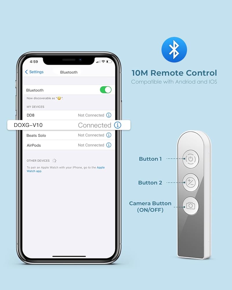 【حامل هاتف قابل لإعادة الشحن وجهاز تحكم عن بعد لاسلكي يعمل بالبلوتوث 】خط شحن USB سهل التوصيل مثل بنك الطاقة والكمبيوتر وما إلى ذلك. حامل الهاتف هذا المزود ببطارية خفيفة مدمجة بقوة 1000 مللي أمبير في الساعة، يمكن أن يعمل لمدة 2-12 ساعة بعد الشحن. نطاق اتصال بلوتوث لاسلكي 10 أمتار، جهاز التحكم عن بعد يجعل من السهل التقاط الصور أو مقاطع الفيديو. حامل هاتف لتسجيل الفيديو.