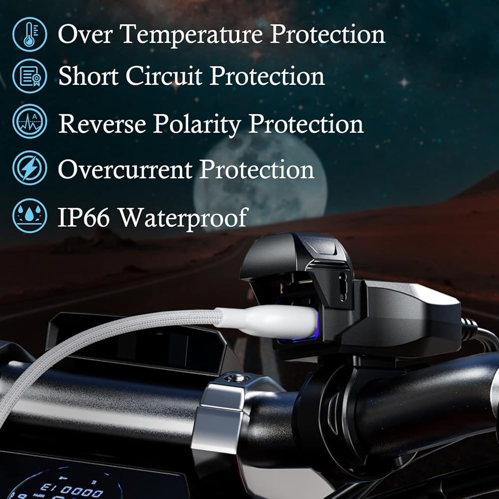 • شحن ذكي آمن: شاحن USB للدراجة النارية هذا مصنوع من مادة ABS المقاومة للهب ومواد نحاسية موصلة جيدة. مع شهادة CE وROHS، شاحن الدراجة النارية ذو تصميم الدائرة الذكي يحمي من التيار الزائد، وارتفاع درجة الحرارة، والشحن الزائد. تأكد من سلامة الشحن.