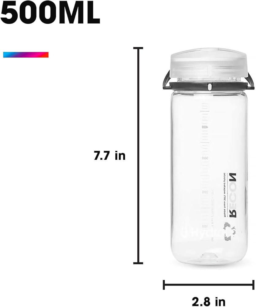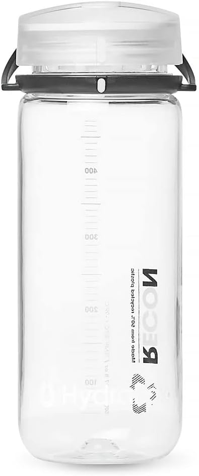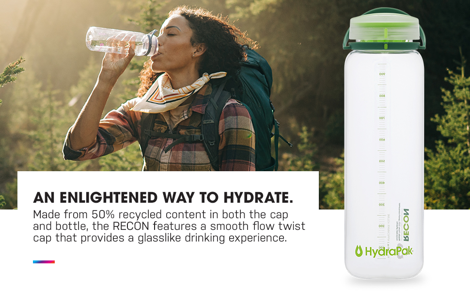 Start a revolution in your backpack. Vividly clear, virtually indestructible, and made out of 50% Recycled Plastic material. RECON was born out of our collective belief that great gear for the trail can and should be lower impact on the environment. An enlightened way to hydrate. To Drink: Align the colored indicator on cap, with matching colored indicator on bottle for a smooth drink-through experience To Close: Twist cap half rotation clockwise until tight, creating a leak-proof seal