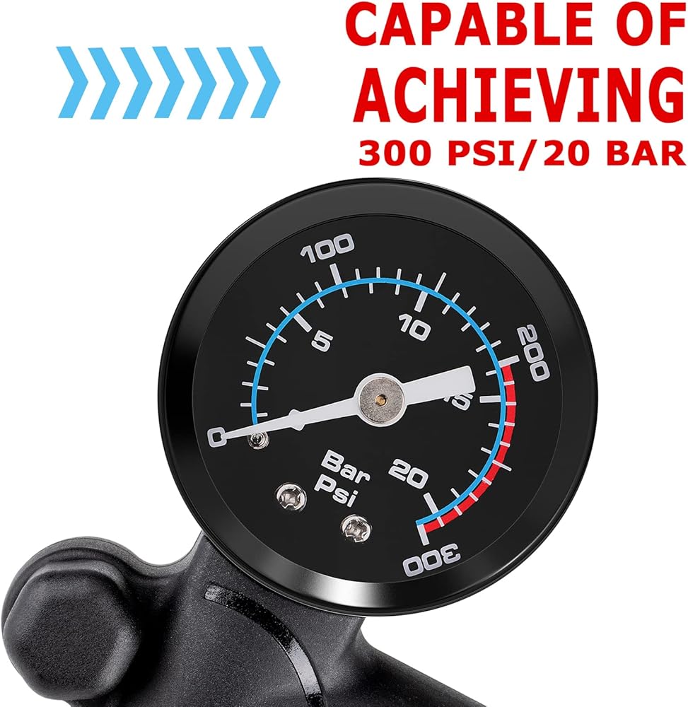 【ضغط الهواء الأمثل】- مضخة الصدمات ذات حجم منخفض، ولكن ضغط مرتفع، قادرة على تحقيق 300 رطل لكل بوصة مربعة / 20 بار. باستخدام مضخة الهواء لامتصاص الصدمات أو شوكات التعليق، يمكنك الحصول بسرعة وسهولة على الضغط الأمثل لدراجتك المنحدرة أو إندورو أو هاردتيل أو الدراجة الجبلية الكاملة.