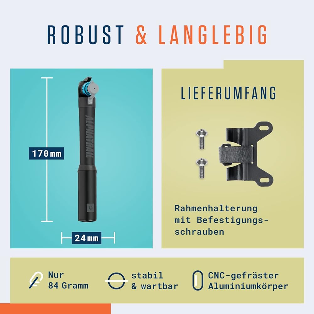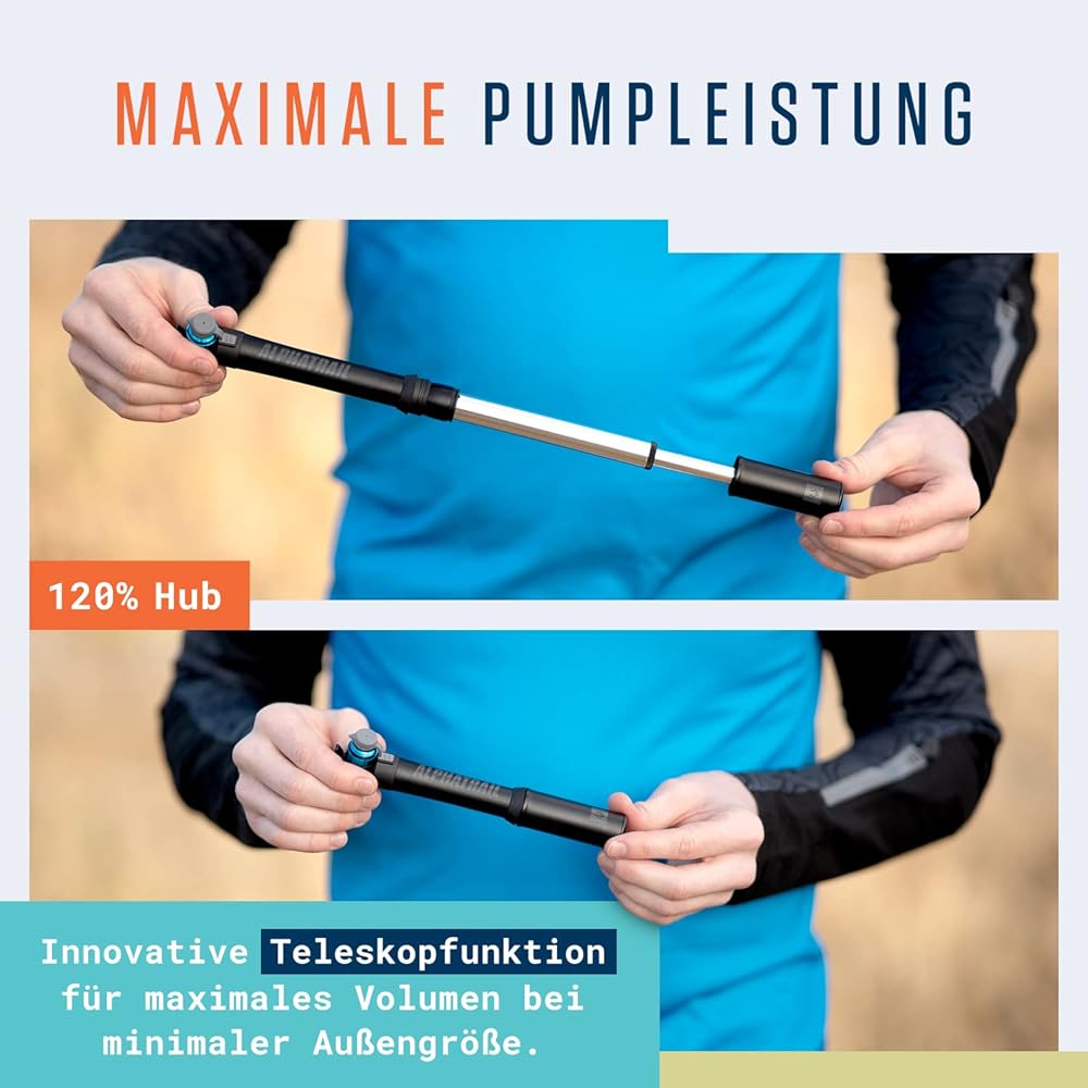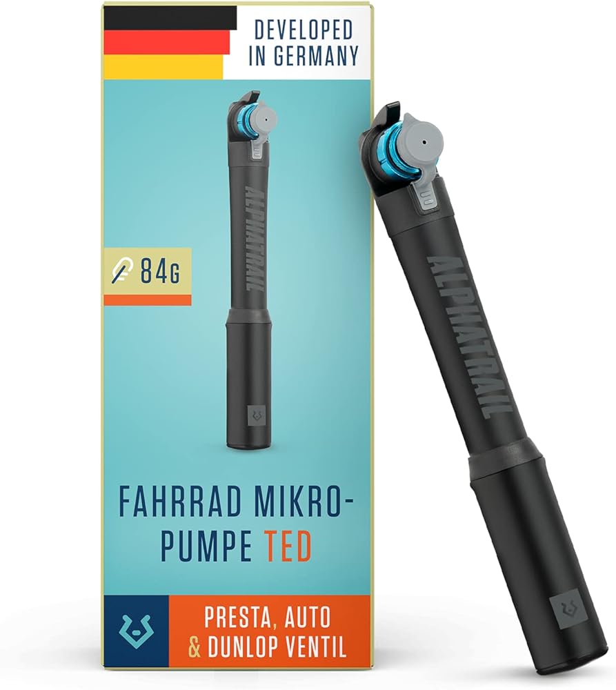 مضخة دراجة صغيرة Ted - لجميع الصمامات 120 رطل لكل بوصة مربعة / 8.3 بار أقصى ضغط I وظيفة تلسكوب فعالة I مضخة دراجة من الألومنيوم بآلة CNC I مضخة دراجة لصمام Presta وSchrader وDV
