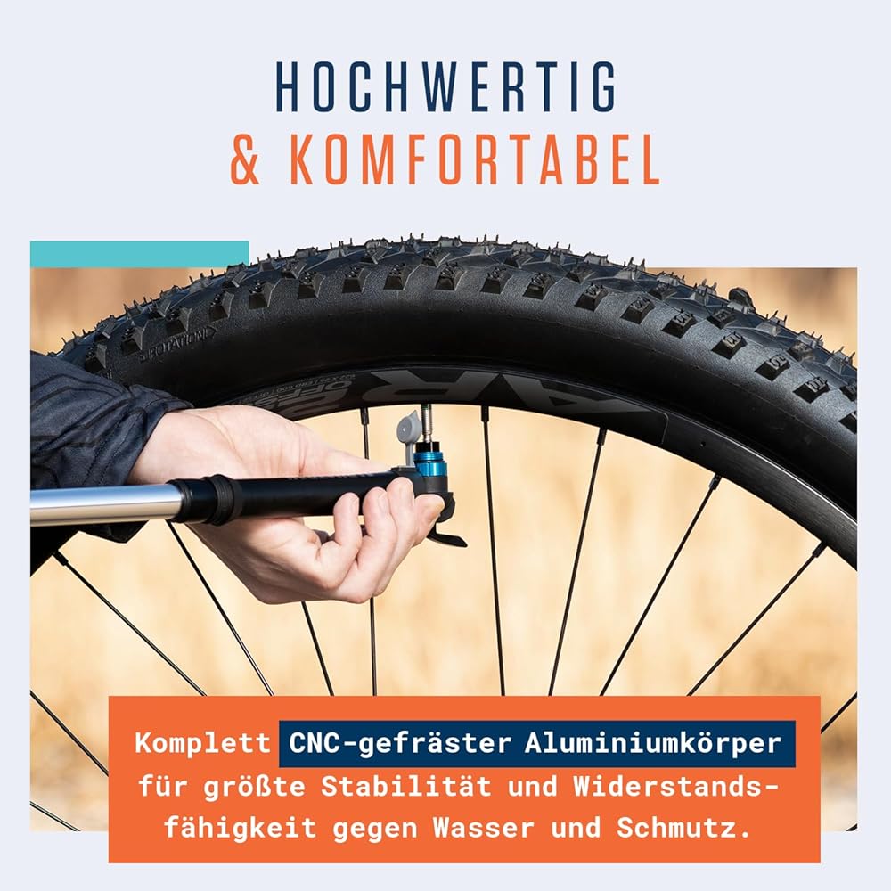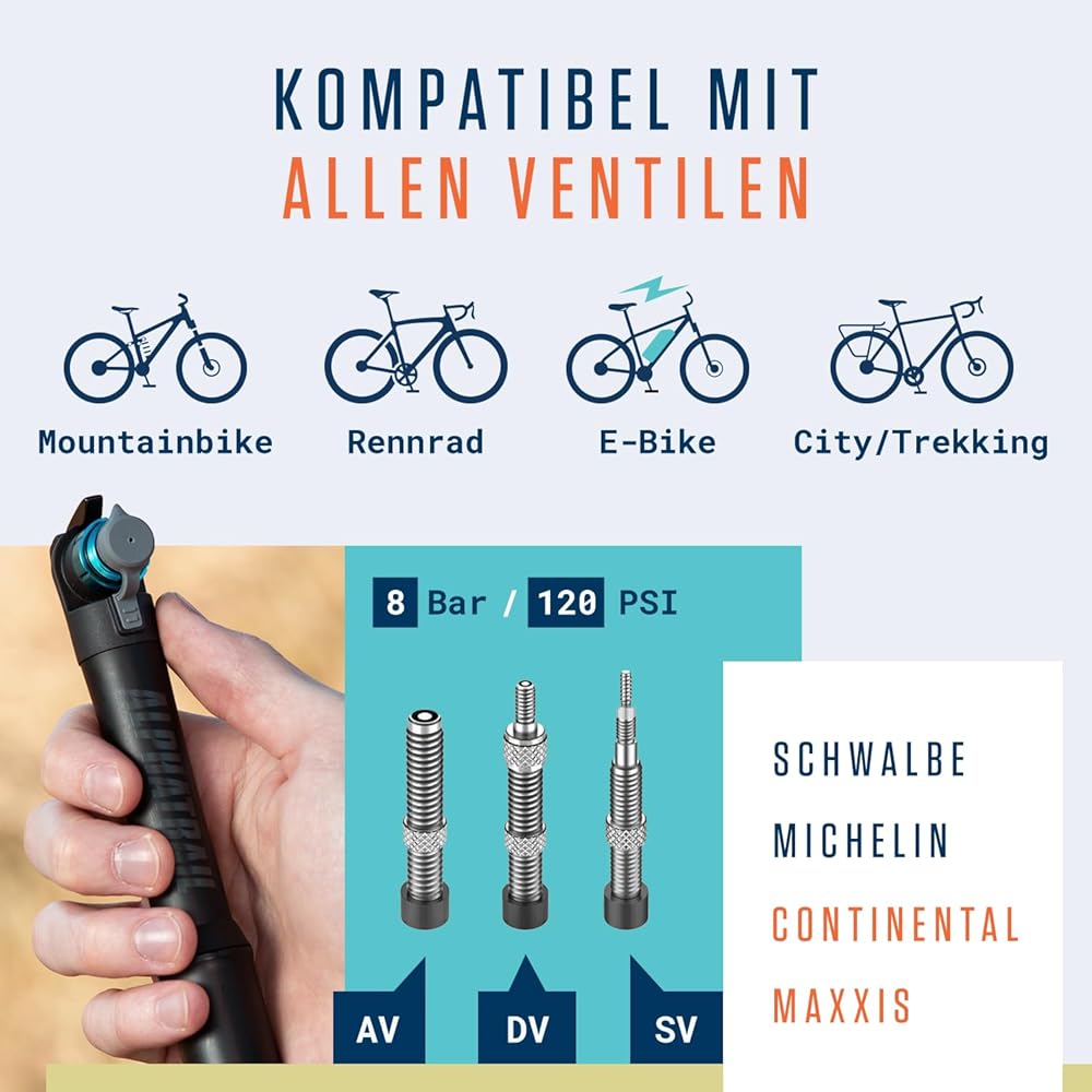 لجميع الصمامات - يمكن تكييف المضخة الصغيرة ذات رأس المضخة الذكية مع صمامات بريستا (SV)، وشرايدر (AV) ودنلوب (DV) في وقت قصير وتتحمل ما يصل إلى 8.3 بار (120 رطل لكل بوصة مربعة). مثالية للطرق والحصى والدراجات الجبلية.