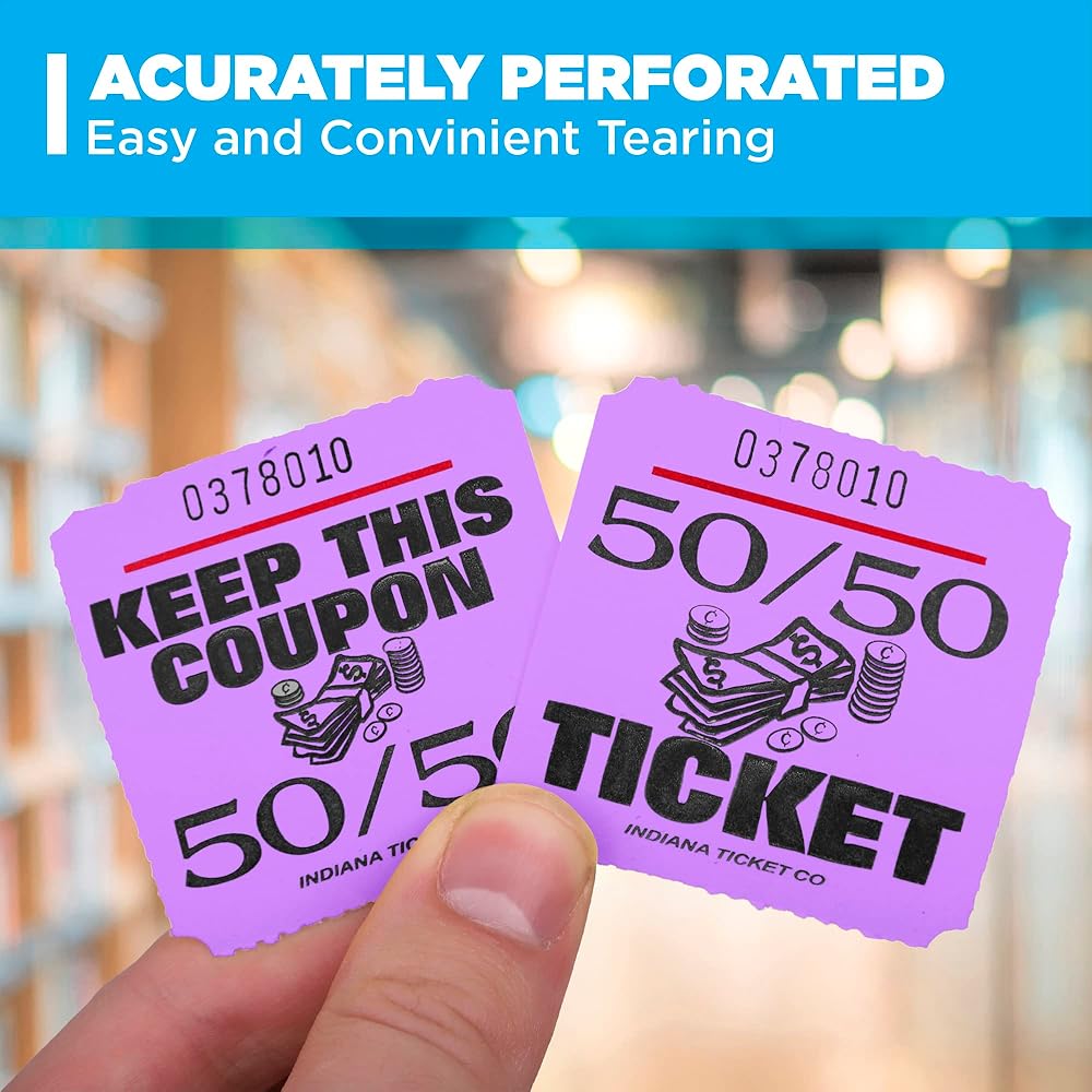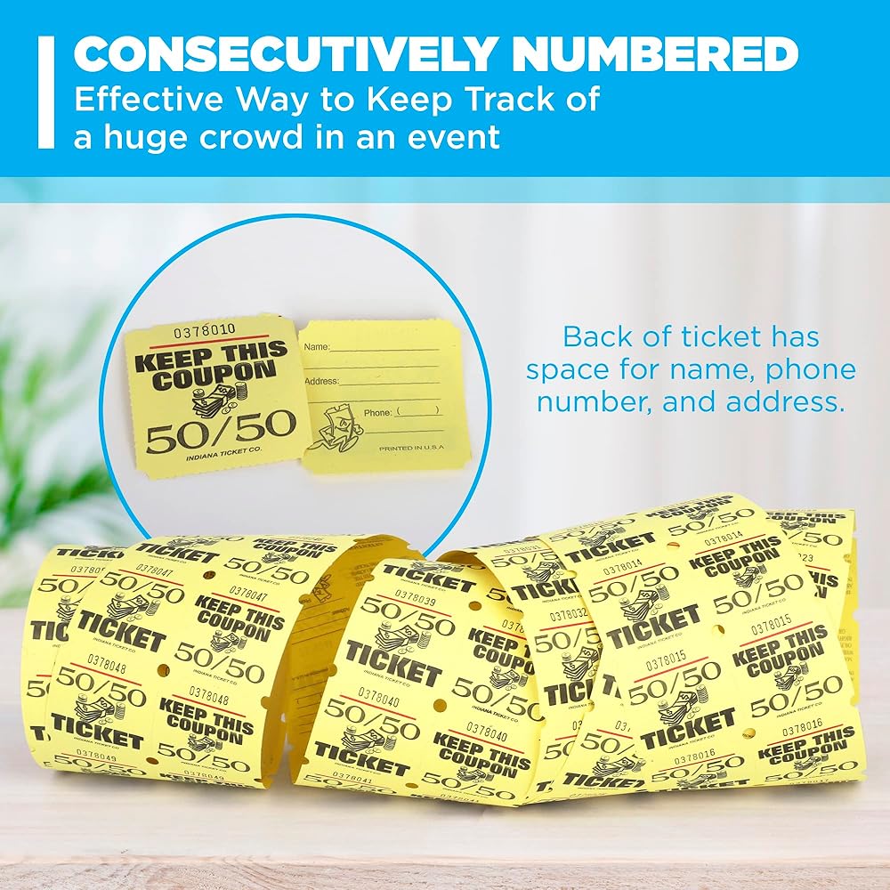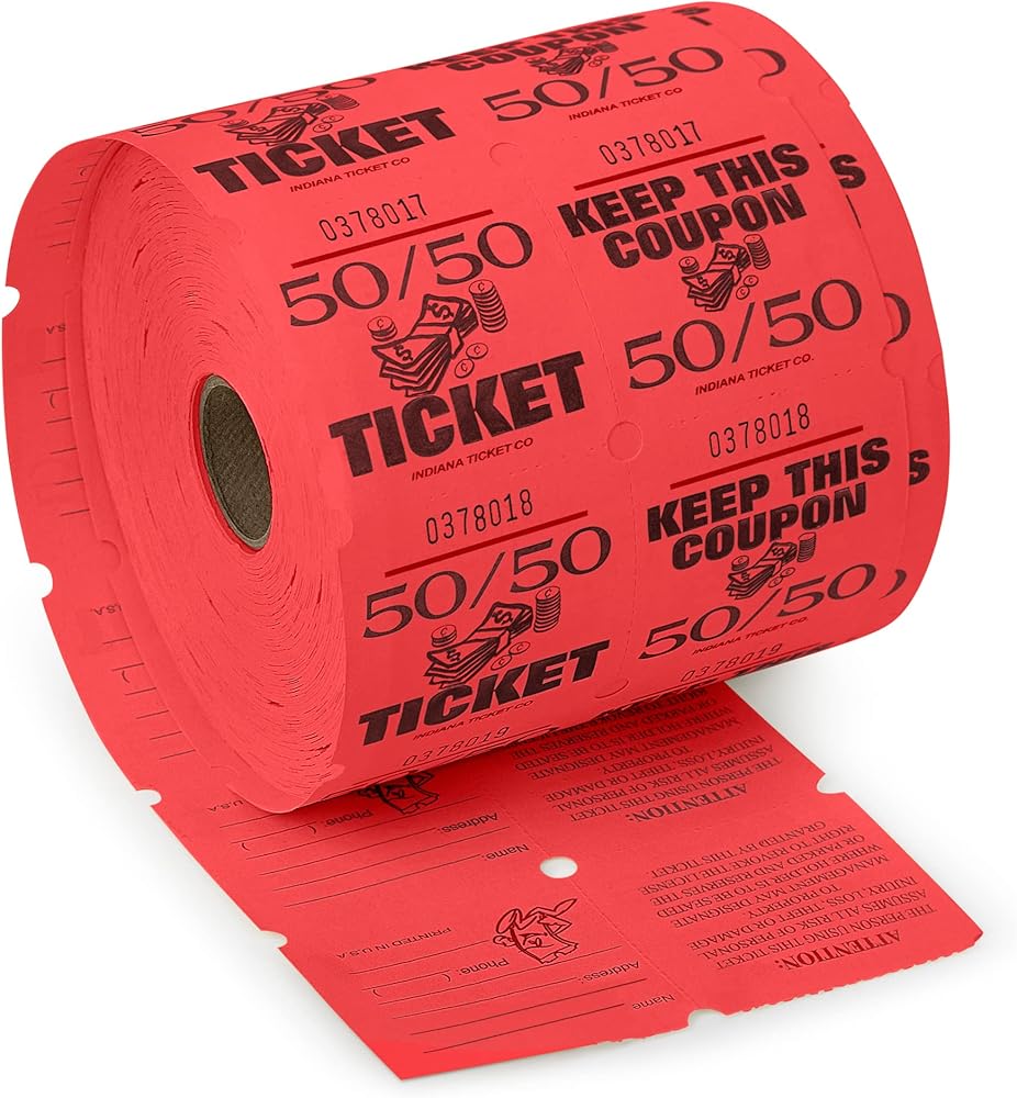 1000 COUNT DOUBLE ROLL - 50/50 raffle tickets double roll 1000 count. Consecutively numbered twice per ticket. The double roll provides matching numbers for deposits and easy tracking, with a quick address/ contact info option on the back.