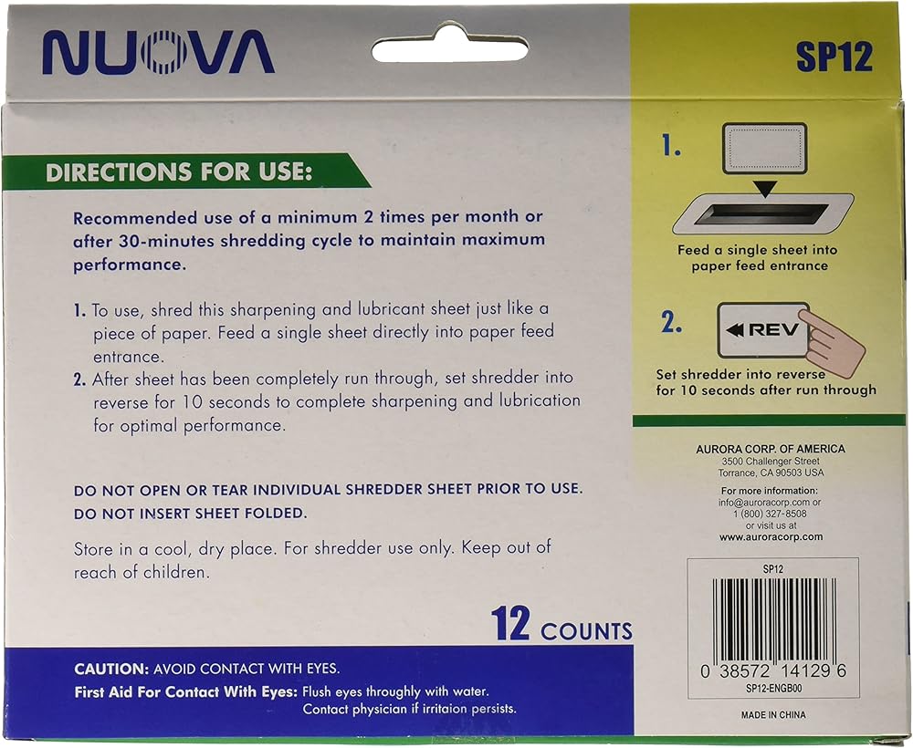 Nuova Shredder Sharpening & Lubricant Sheet made with 100% natural, non-toxic materials free from harmful chemicals. Easy to use for Sharpening, cleaning and lubricating shredder blades prevents paper jams and optimizing shredder performance.