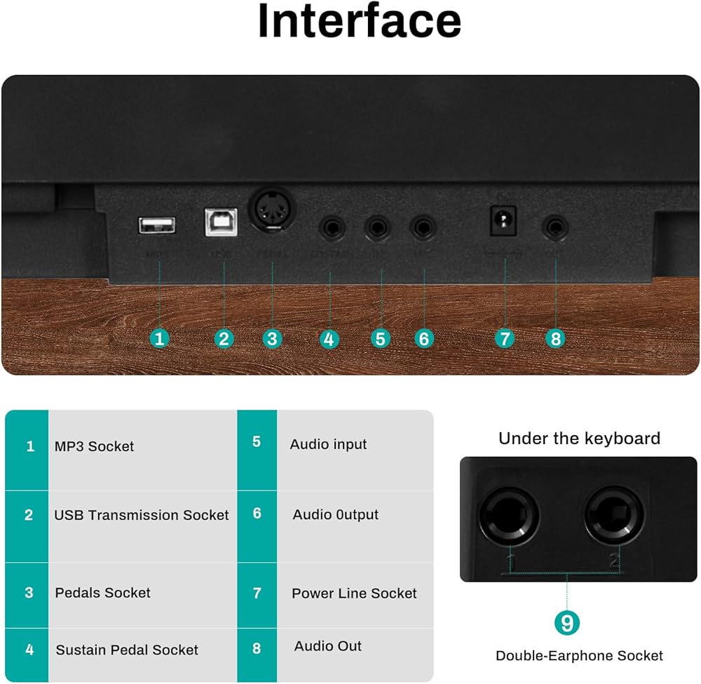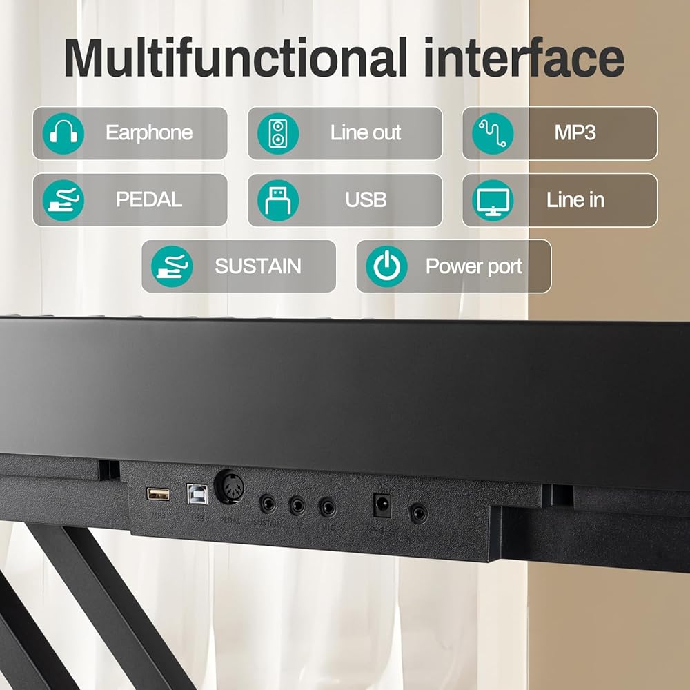 🎹[تجربة عالية]: تم تصميم AODSK S-300 لتوفير الراحة والاتصال، ويتميز بمقابس سماعة رأس مزدوجة، وحامل معدني على شكل حرف U، وخيارات اتصال متعددة بما في ذلك USB وMIDI، مما يسمح بالتكامل السلس في كل من إعدادات التدريب والأداء.