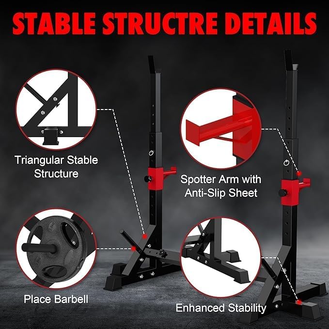 🏋【هيكل ثابت】: تعتمد قاعدة رفوف القرفصاء على هيكل مثلث لتعزيز الثبات. ونحن نستخدم أقدام مطاطية ملولبة، وامتصاص الصدمات، ومضادة للانزلاق ومقاومة للاهتراء، وصواميل معدنية صلبة معززة لجعلها أكثر أمانًا.