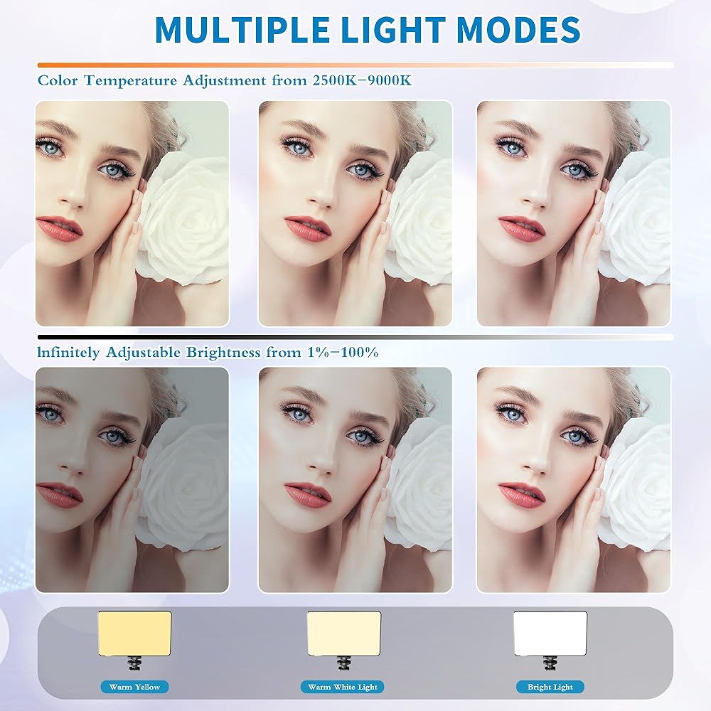 【3 أوضاع إضاءة، سطوع قابل للتعديل】درجة حرارة لون المصباح هي: 2500K-9000K. 3 أوضاع لدرجة حرارة اللون (أبيض ساطع، أصفر دافئ + أبيض دافئ، أصفر دافئ) يمكن ضبط السطوع. يمكنك التحكم في درجة سطوع الضوء وضبط وضع الإضاءة المناسب لمشهد التصوير في المشاهد المختلفة.