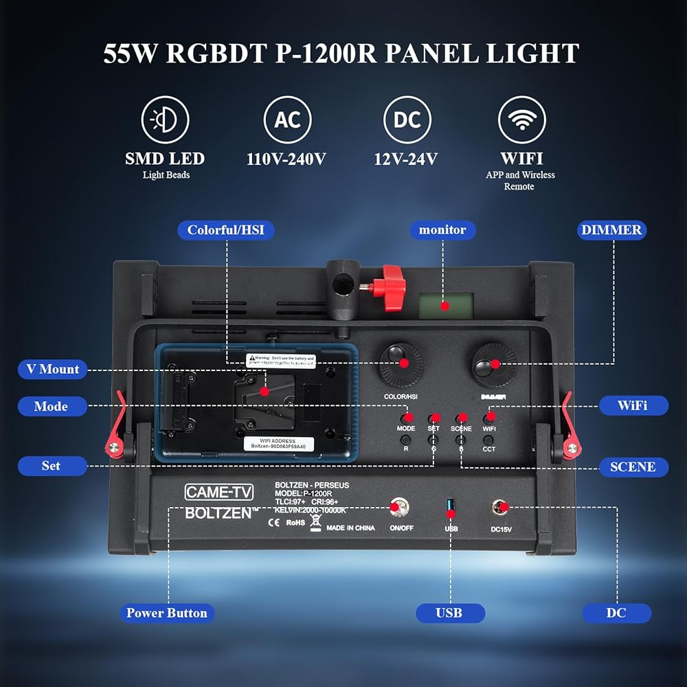 Came-TV LED Video Light Panel Lighting RGBWW المحمولة Boltzen Perseus 1200R 55W SMD أضواء سفر ناعمة 2000-10000K، 36 وضع مشهد كامل اللون TLCI97+ CRI96+، التحكم في التطبيق للتصوير الفوتوغرافي في الاستوديو