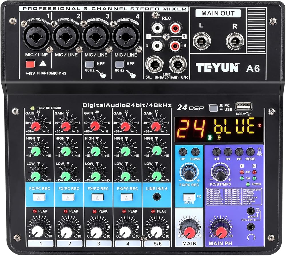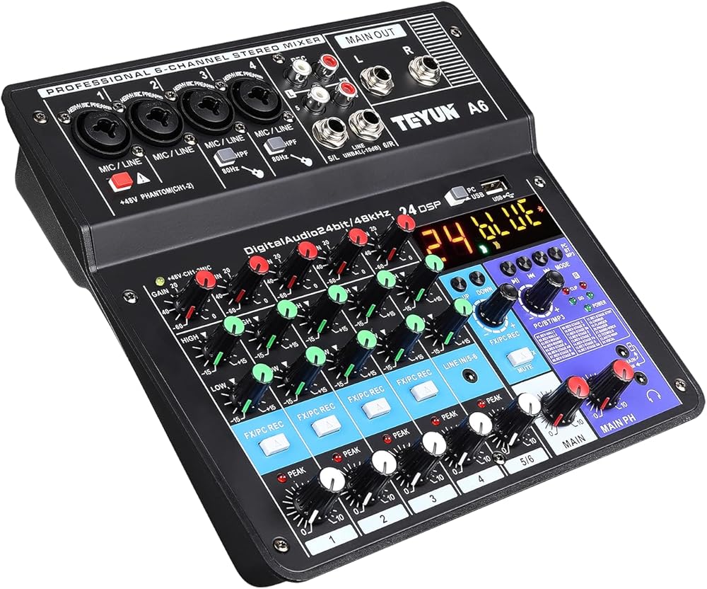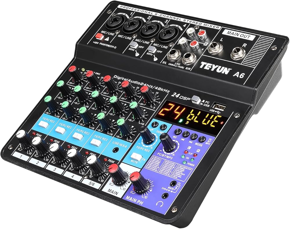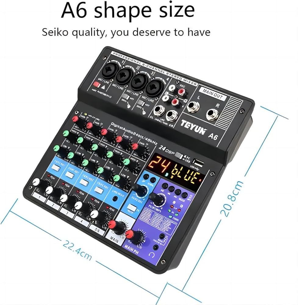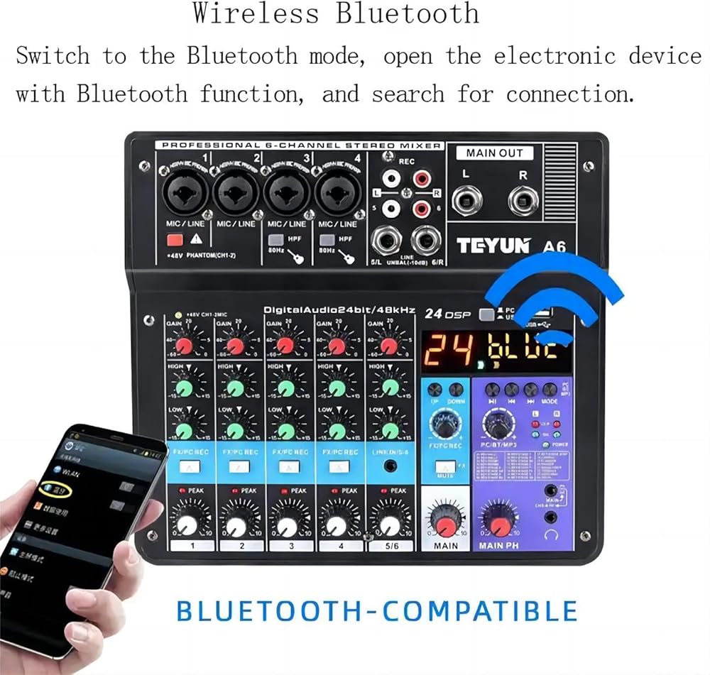 A6Mixer live sound card all-in-one machine Patented product Quality supply Product information Model:A6 Color:Black Material:Metal+ABS Single product packaging:27.3*8.2*26CM/Gross weight:1.15/KG Product parameters Frequency response:0.05%dB/-2.0dB(20HzTo20kHz),Reference rated output level@1kHz,GAINKnob:Medium Total harmonic distortion(THD+N):0.02%@+10dBu(20HzTo20kHz),GAINKnob:Medium Noise(20HzTo20kHz):Residual output noise,-85dBu(STEREO OUT,STEREO LEVE),GAINKnob:Small Crosstalk(1kHz)*2:-83dB Input/Output impedance: Microphone input:3kΩ,Line input:10kΩ Output:150Ω(Balance)75Ω(Non-equilibrium) AESDigital signal input and output:110Ω Input channel:MIC*4、2REC、PC、2LINE、USB、BT、3.5MINI Output channel:STEREO OUT:2,PHONES:1,3.5MINI MAIN PH OUT:1、2.GROUP PH:1.3.5MINI LOOP BACKOutput:2.REC Bus:Stereo:1 ,GROUP:1. Input channel function: HPF(Mono)80Hz,12dB/octave(CH3,4)EQ HIGH Gain:+15dB/-15dBFrequency:10kHzOblique frequency:EQ LOW Gain:+15dB/-15dBFrequency:100kHzOblique frequency:PEAK LEDWhenEQAfter the signal reaches the distortion below3dBWhenLEDLight up LEDIndication:MAIN STEREO LEVEL Knob,WhenMAIN LEVELSignal Arrival-10dBWhen the green light comes on,Reach below distortion3dBWhen,The red light comes on Input/output level:MIC(-60dB)LINE OUTPUT(-40dB)MAX OUT(+12dB) USBAudio:2IN/2OUT USBAudio2.0Compatible,Decoding rate:48.1kHz,BitDepth:24-bit Effect category:Adjust volume effect independently:True number effect processing Phantom supply voltage:Support large diaphragm capacitor wheat Voltage adapter:DC 5V/2.0AStandard 24SpeciesDSP Reverberation: 1.Simulate the reverberation of small spaces such as concert halls. 2.Simulate small space(Auditorium)Reverberation of Acoustic Environment 3.Simulate the reverberation of large spaces such as theaters. 4.Valley echo Electronic synthesis sound effect 5.Electronic mixed sound(FallingAMajor) 6.Electronic mixed sound(AMajor) 7.Electronic mixed sound(FallingBMajor) 8.Electronic mixed sound(BMajor)
