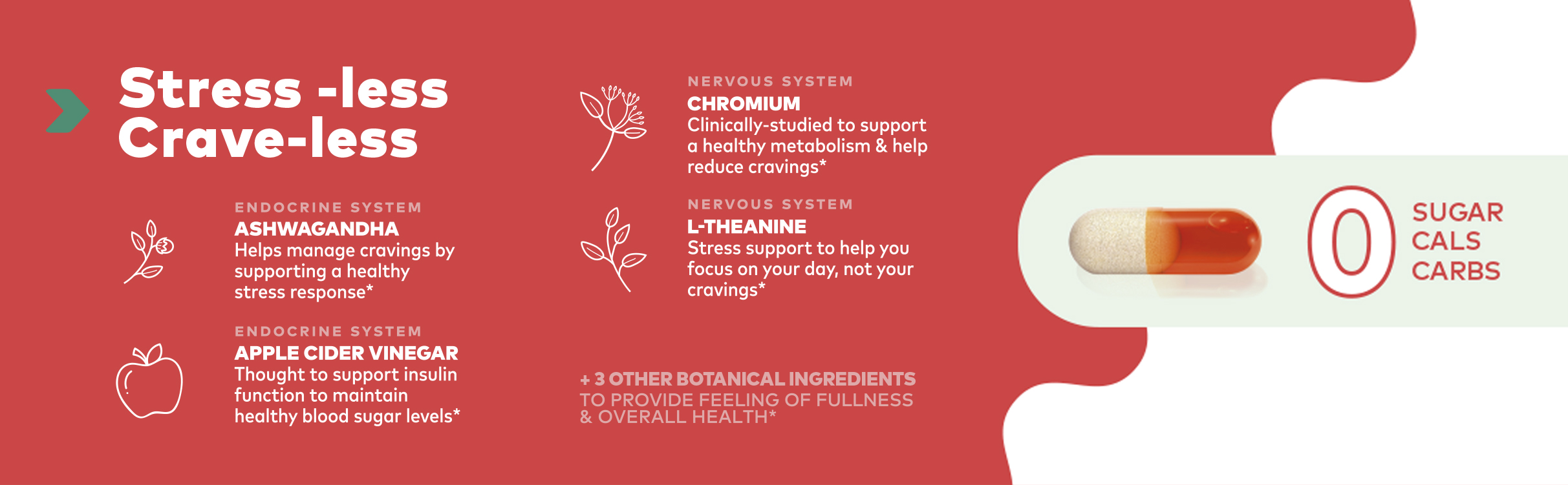 تم تصميم هذا المكمل النباتي خصيصًا لتناول الطعام أثناء التوتر للمساعدة في إدارة التوتر الذي يسبب الرغبة الشديدة، ويمنحك شعورًا أكثر رضاءً بالامتلاء مع دعم عملية التمثيل الغذائي لديك.