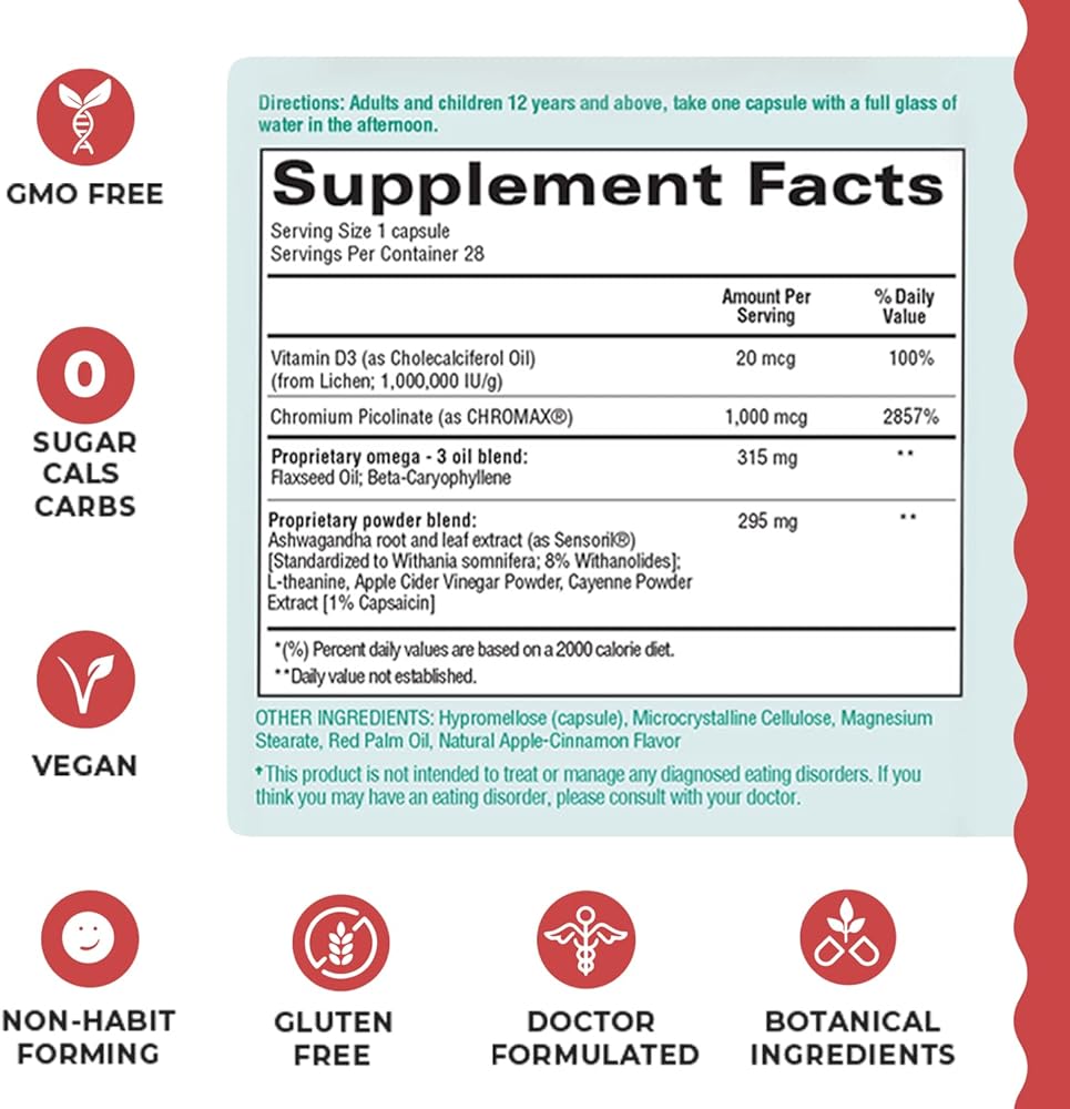 تم تركيبه للمساعدة في التحكم في الرغبة الشديدة من خلال دعم عملية التمثيل الغذائي الصحي باستخدام الأشواغاندا وخل التفاح والكروم والثيانين.