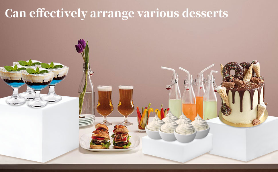 عرض وجهات نظر مختلفة: تأتي رافعات البوفيه وحوامل الطعام هذه في 3 أحجام مختلفة: كبير - 8 بوصة × 8 بوصة × 6 بوصة، متوسط - 7 بوصة × 7 بوصة × 4 بوصة، صغير - 6 بوصة × 6 بوصة × 2 بوصة. تضيف الارتفاعات المختلفة أناقة وتعزز الطبقات، مما يسمح بعرض الحلوى الجميلة بشكل كامل.