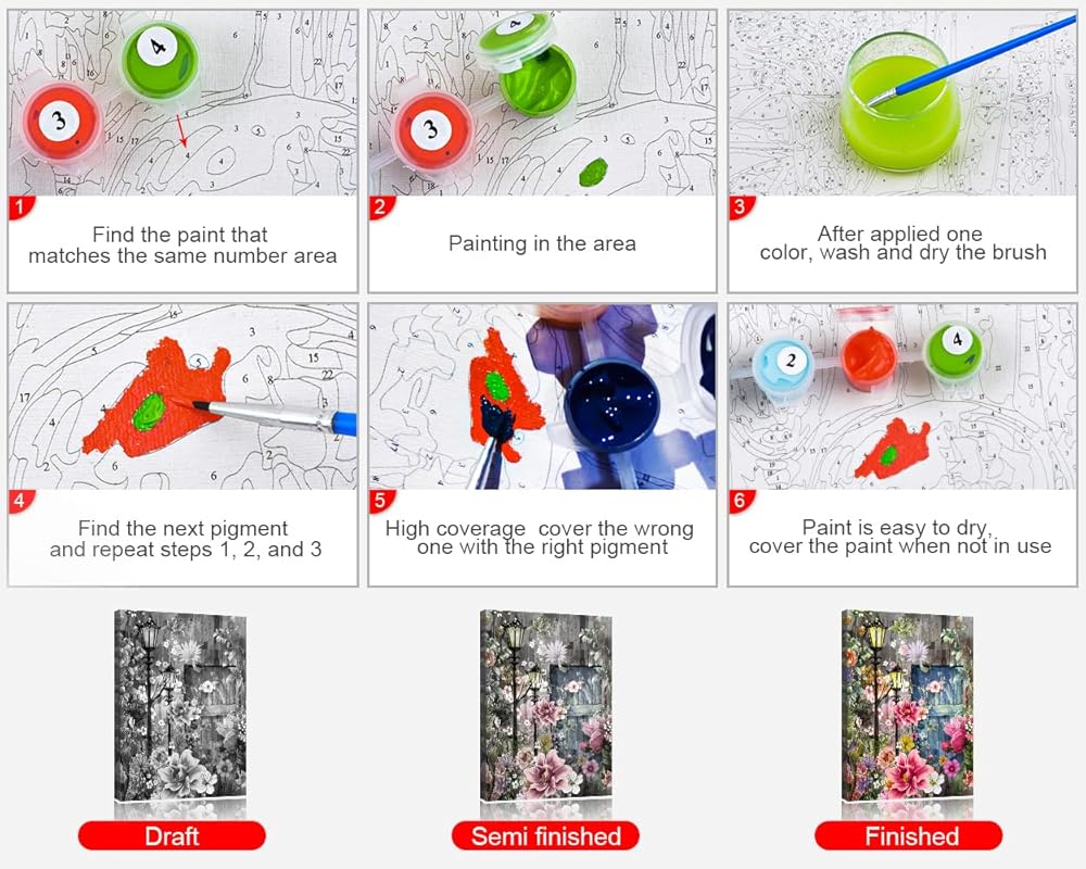 تشمل العبوة: تتضمن مجموعات الطلاء بالأرقام لوحة قماشية مقاس 40.64 سم × 50.8 سم (بدون إطار)، و3 فرش من النايلون، ومجموعة كاملة من طلاءات الأكريليك، وورقة مرجعية وعينة من اللوحة الزيتية.