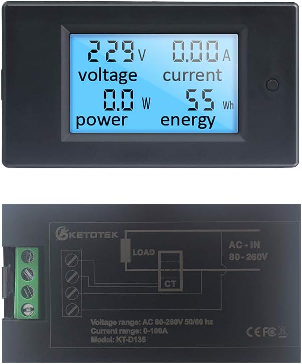• الفولتميتر المتردد 80-260 فولت، مقياس التيار المتردد 0-100 أمبير، الطاقة النشطة 0-22 كيلووات، الطاقة الكهربائية 0-9999 كيلووات ساعة، يرجى عدم تجاوز المعلمات المقدرة.