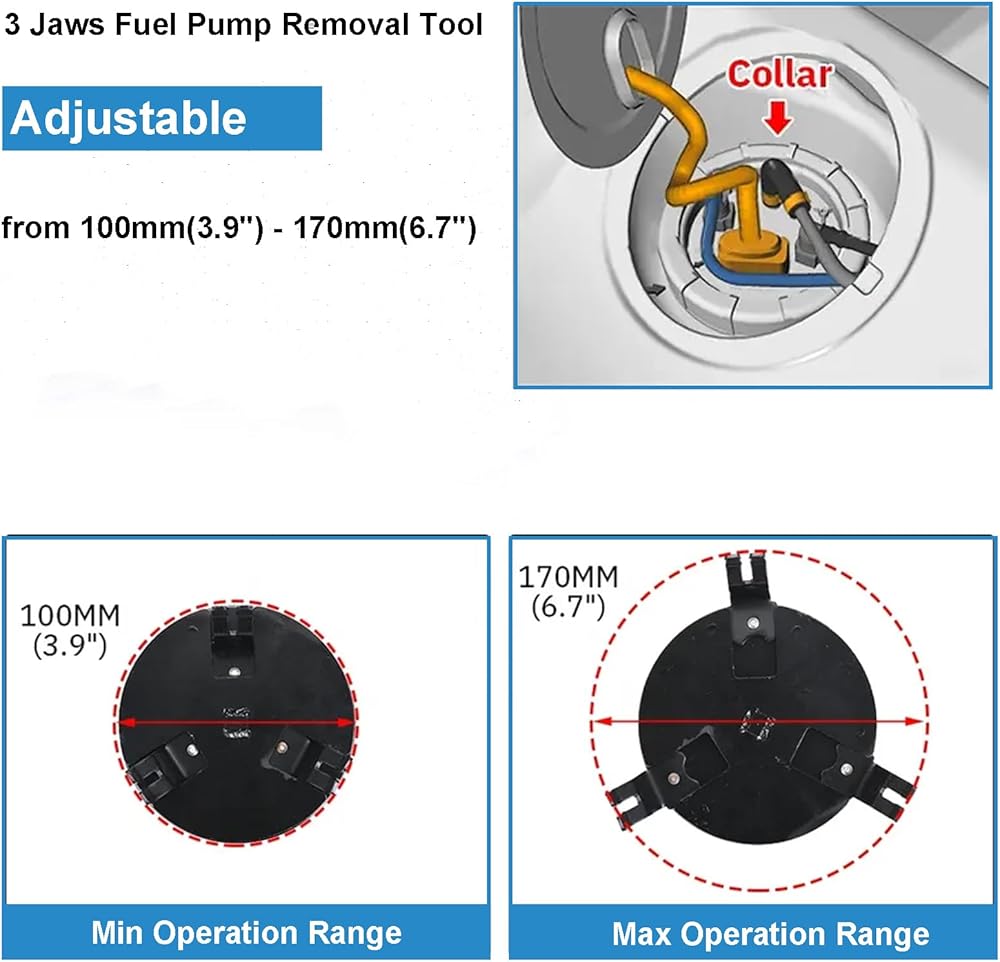 أداة إزالة مضخة الوقود العالمية، أداة حلقة قفل مضخة الوقود القابلة للتعديل، أداة حلقة قفل خزان الوقود ذات 3 فكات دائرية مع مفتاح فك 3.9 بوصة إلى 6.7 بوصة