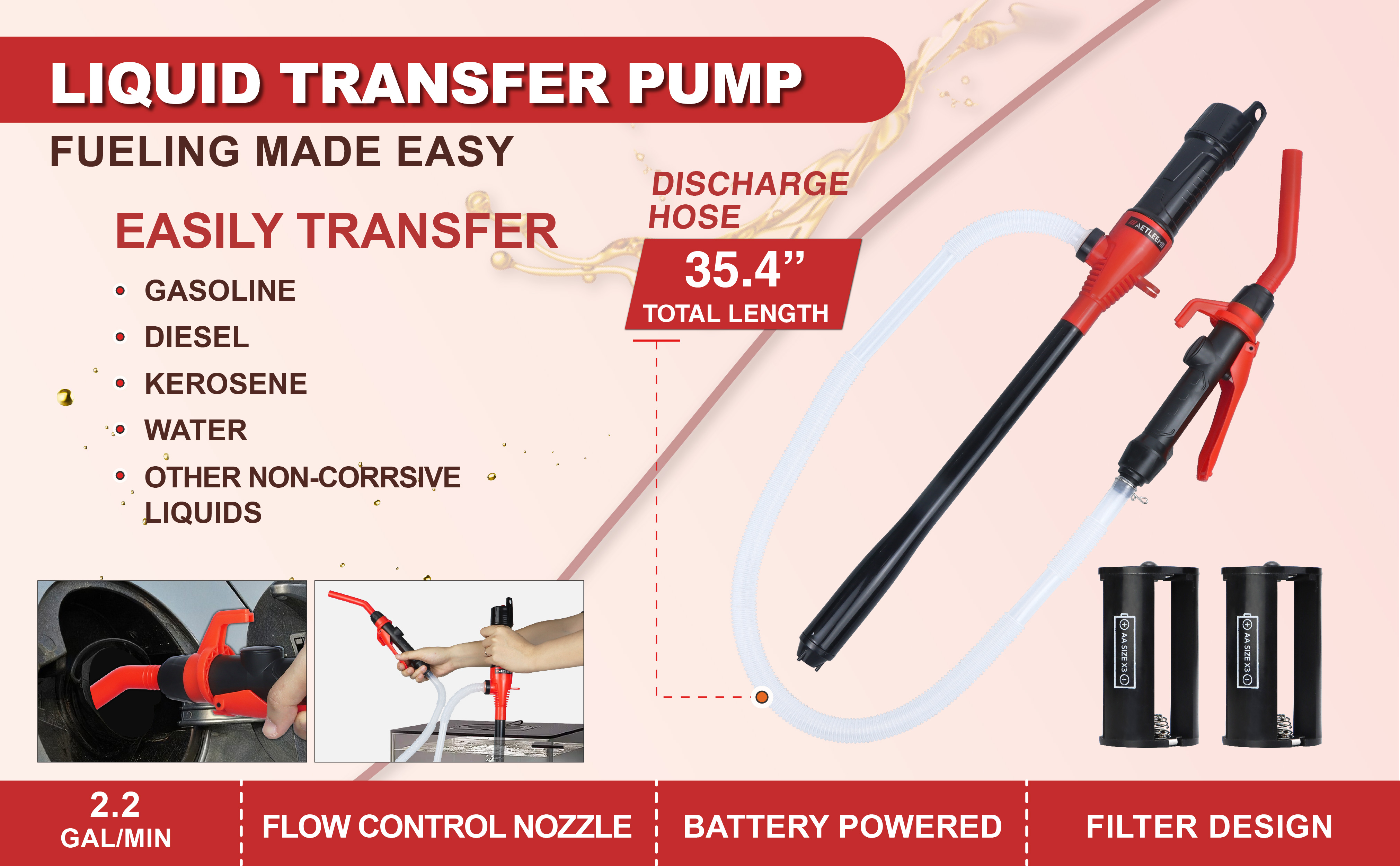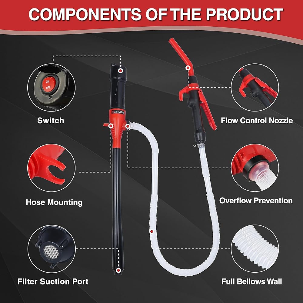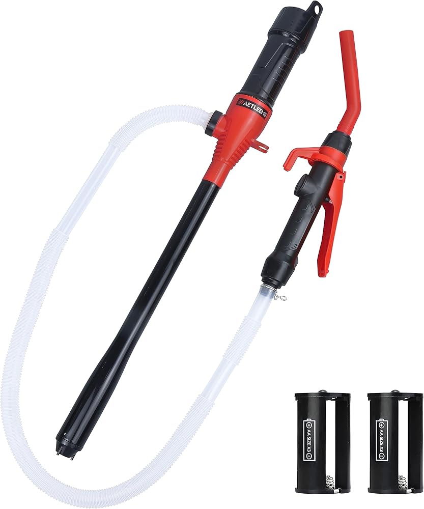 مضخة بطارية طاقة محمولة من AETLEEMO، مضخة نقل سائل تعمل بالبطارية مع فوهة للتحكم السريع في التدفق والتوقف، خرطوم طويل جدًا للبنزين والديزل الكيروسين والمزيد، 2.2 جالون في الدقيقة
