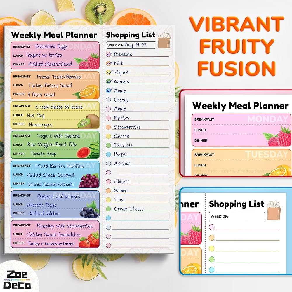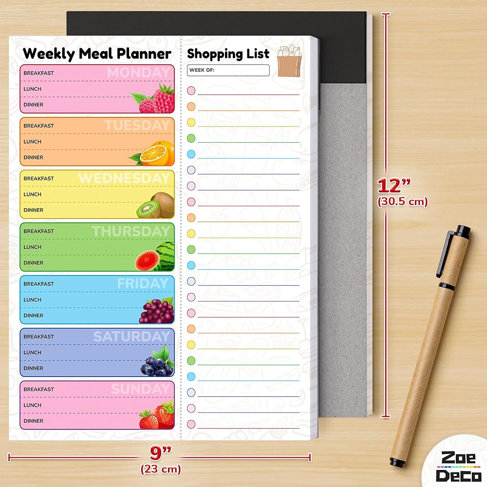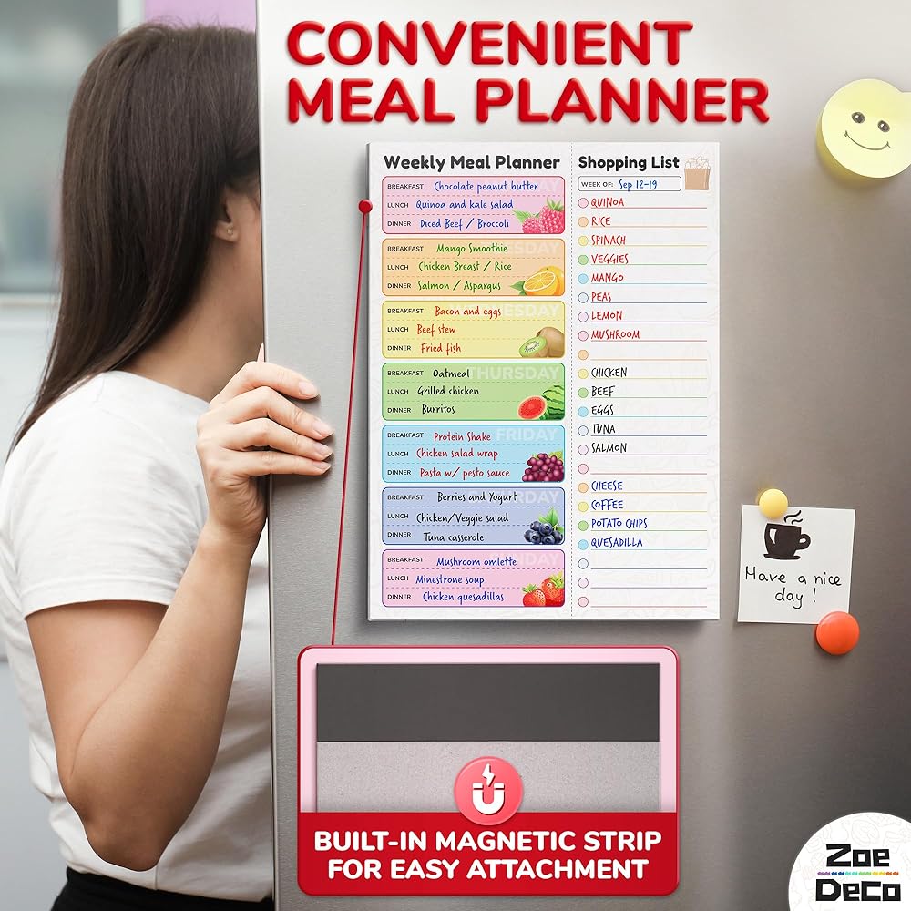 Experience the joy of organized meal planning w/ the Zoe Deco colorful & vibrant weekly meal planner. Bursting with cheerful, fruit-design, it adds a dash of charm to your kitchen. Crafted for convenience, it helps create detailed meal plans and comprehensive grocery lists, saving you precious time and money. Its strong magnetic strip ensures it always stays within your sight on the fridge. The high-quality, durable material ensures it withstands the test of time. Let the Zoe Deco Weekly Meal Planner turn your food planning into a delightful, stress-free activity, and elevate your kitchen aesthetics with its playful, colorful design.