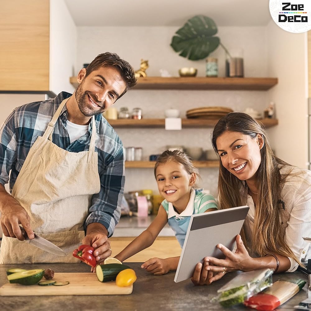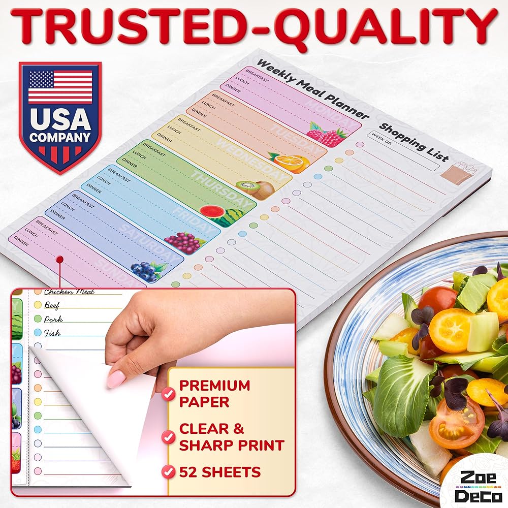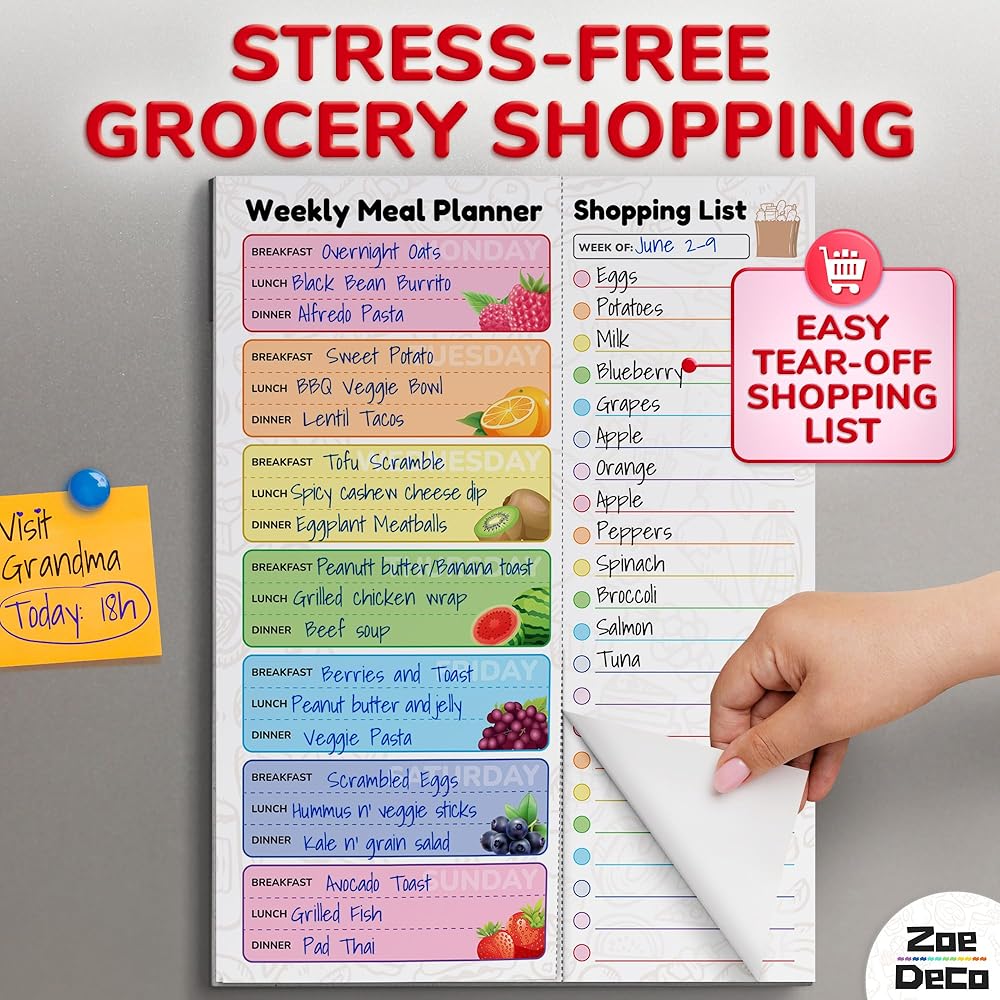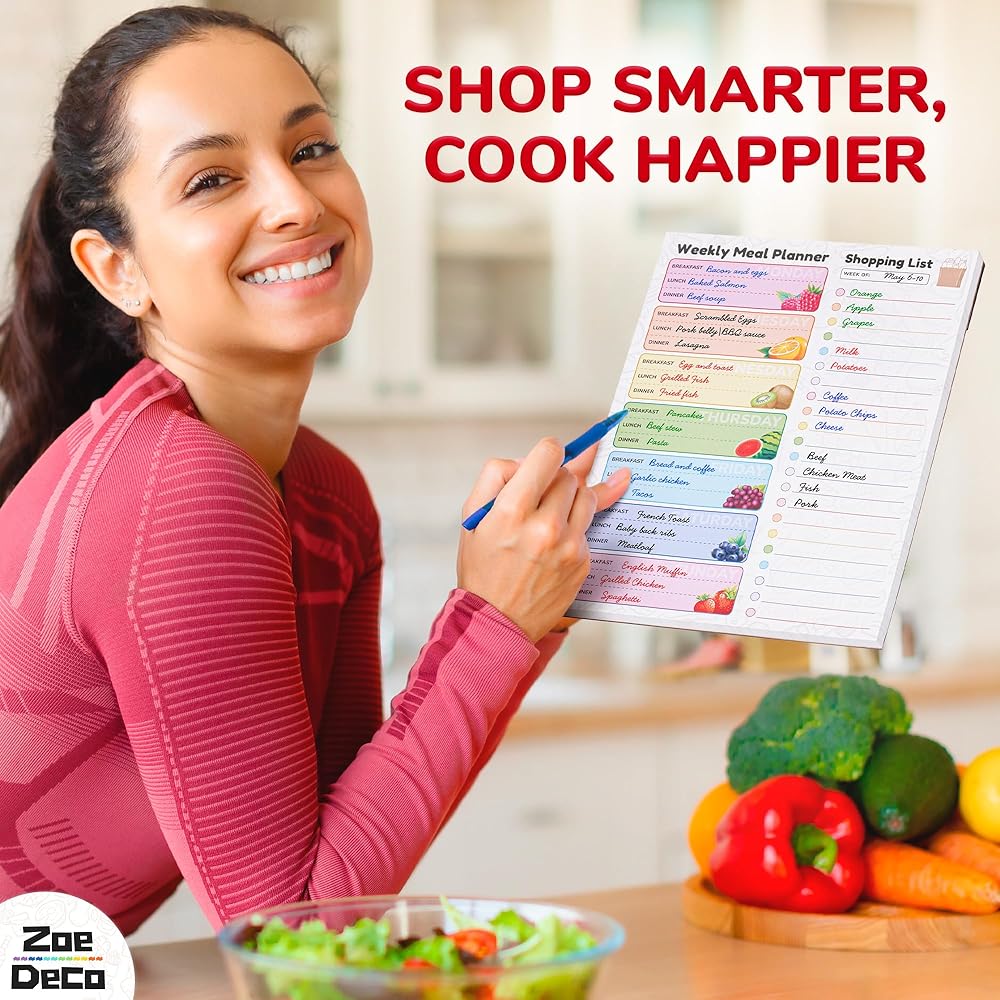 Experience the joy of organized meal planning w/ the Zoe Deco colorful & vibrant weekly meal planner. Bursting with cheerful, fruit-design, it adds a dash of charm to your kitchen. Crafted for convenience, it helps create detailed meal plans and comprehensive grocery lists, saving you precious time and money. Its strong magnetic strip ensures it always stays within your sight on the fridge. The high-quality, durable material ensures it withstands the test of time. Let the Zoe Deco Weekly Meal Planner turn your food planning into a delightful, stress-free activity, and elevate your kitchen aesthetics with its playful, colorful design.