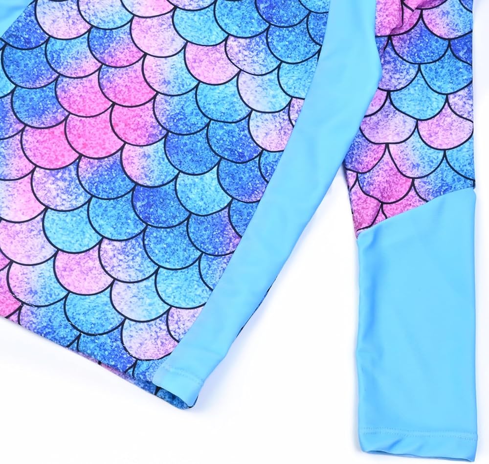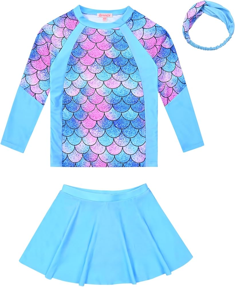 الزي: ملابس السباحة للفتيات تأتي مع بلوزة بأكمام طويلة، وتنورة، وعصابة رأس. تحتوي التنورة على شورت بالداخل لحماية خصوصية فتاتك. توفر ملابس السباحة ذات الأكمام الطويلة تغطية رائعة لحماية بشرة الفتيات الحساسة من الشمس.