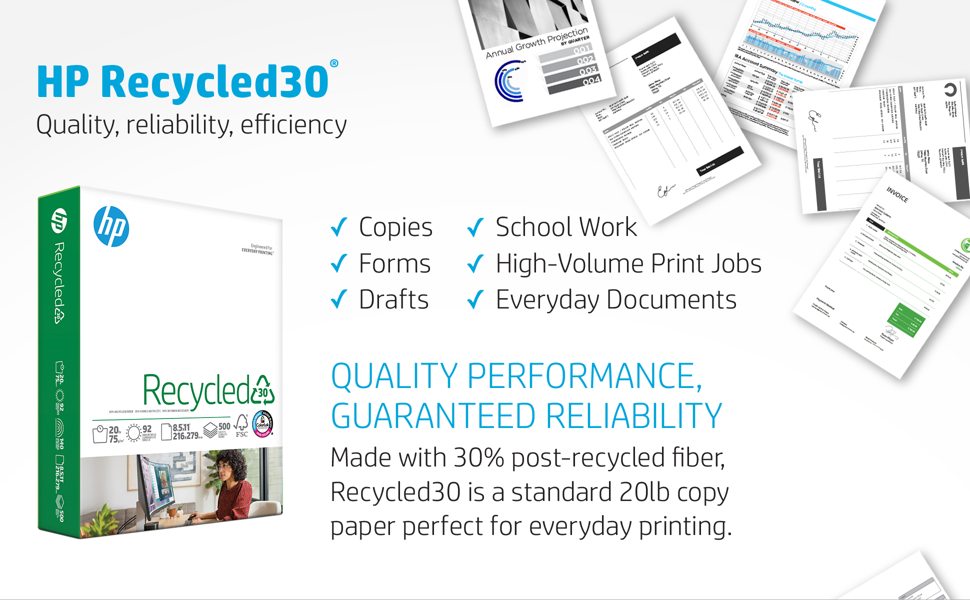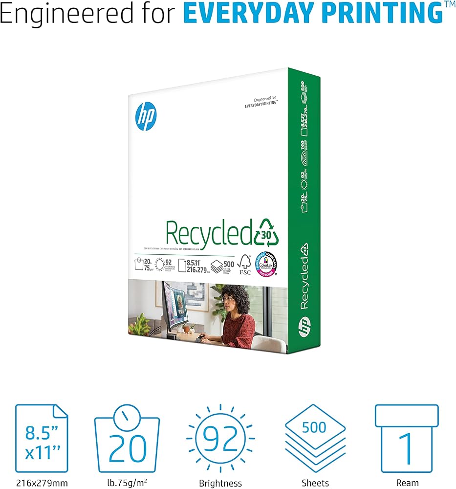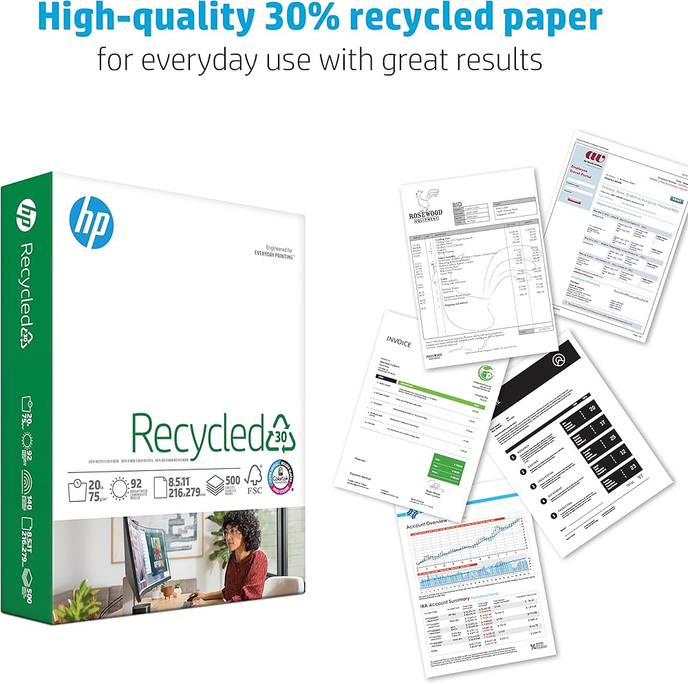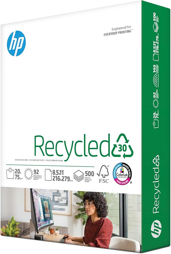 30% POST-CONSUMER RECYCLED FIBER - HP Recycled30 is a 20 lb paper great for high-volume printing, copies, drafts and other everyday business documents. Perfect for black and white printing with recycled paper.