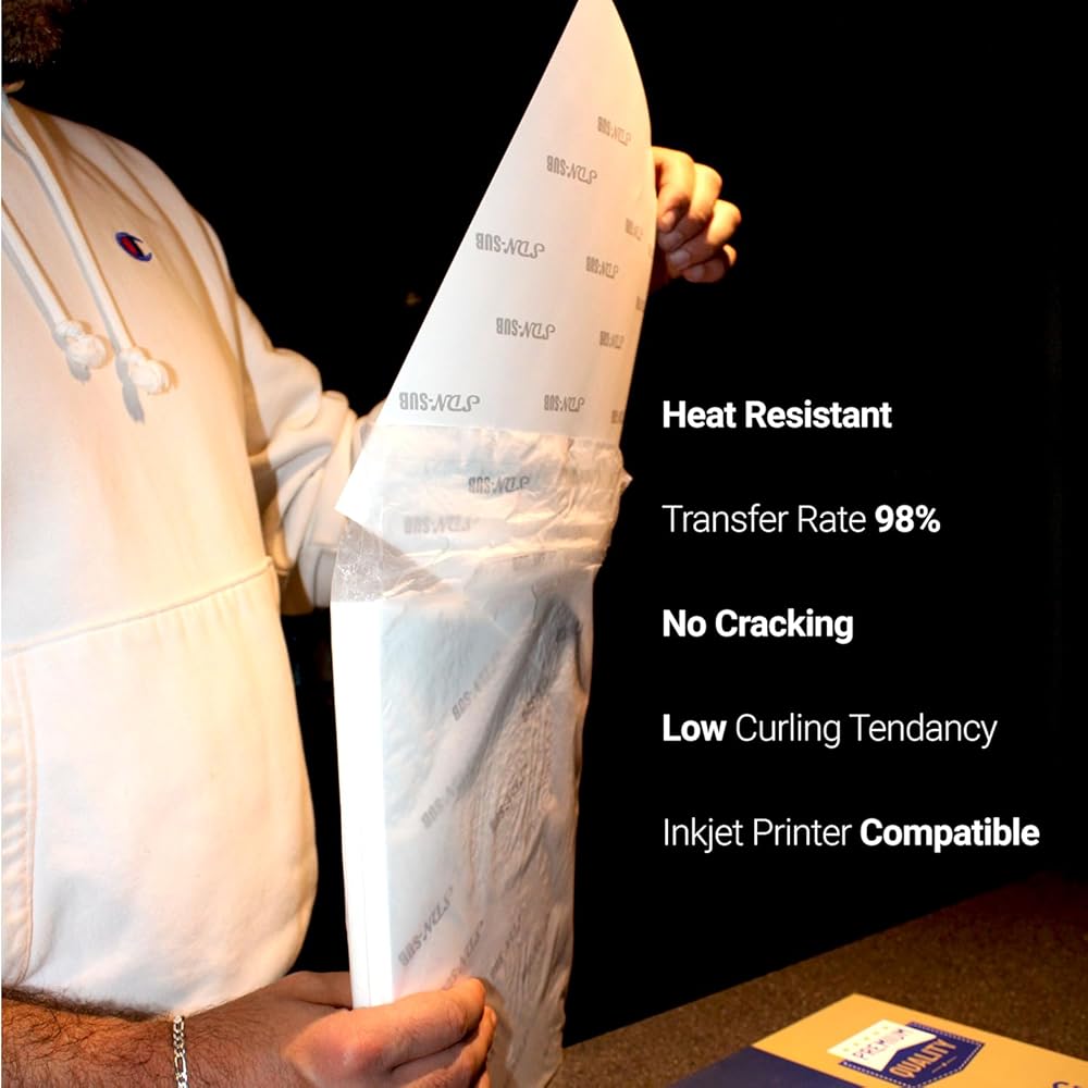 𝐂𝐫𝐚𝐜𝐤-𝐅𝐫𝐞𝐞 𝐏𝐫𝐢𝐧𝐭𝐬: يضمن ورق التسامي الخاص بنا المتانة مع المطبوعات التي تظل سليمة وخالية من أي علامات للتشقق؛ استمتع براحة البال مع العلم أن تصميماتك ستحافظ على سلامتها، حتى بعد الاستخدام أو التعامل المتكرر، للحصول على نتائج طويلة الأمد