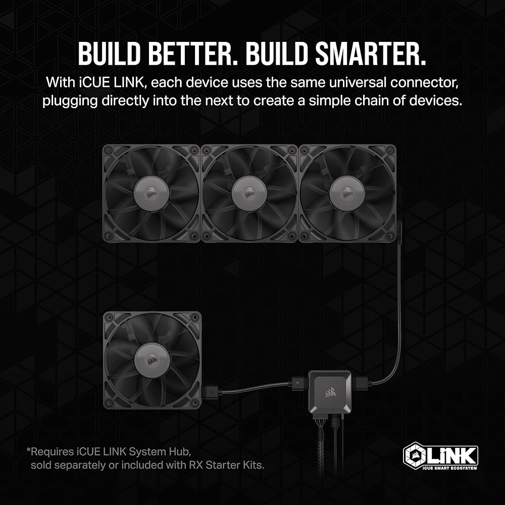 With a groundbreaking design, CORSAIR RX120 RGB 120mm PWM Fans are among the highest performing fans in their class, delivering superior airflow at speeds up to 2,100 RPM while producing our lowest tested noise levels. Thanks to patent-pending iCUE LINK technology, your fans can connect seamlessly together, all connected to the included iCUE LINK System Hub with a single cable. Eight RGB LEDs shine with your custom lighting effects, with a built-in side window for more viewing angles. CORSAIR AirGuide Technology focuses airflow where it's needed most while a Magnetic Dome bearing ensures high longevity and low noise, alongside Zero RPM mode for virtual silence at low loads.