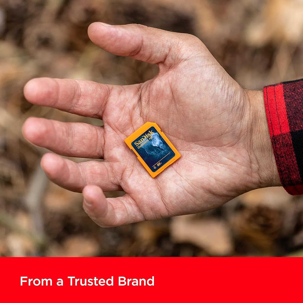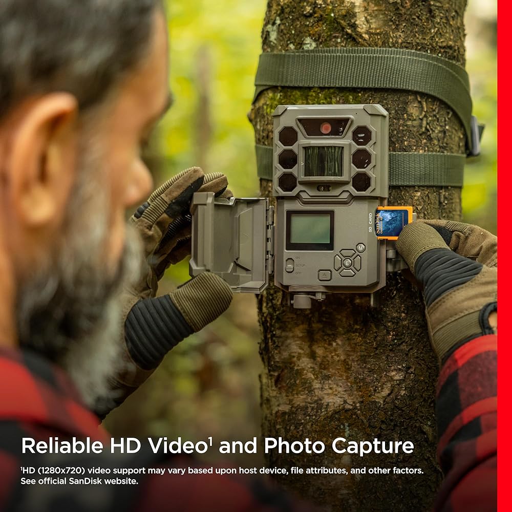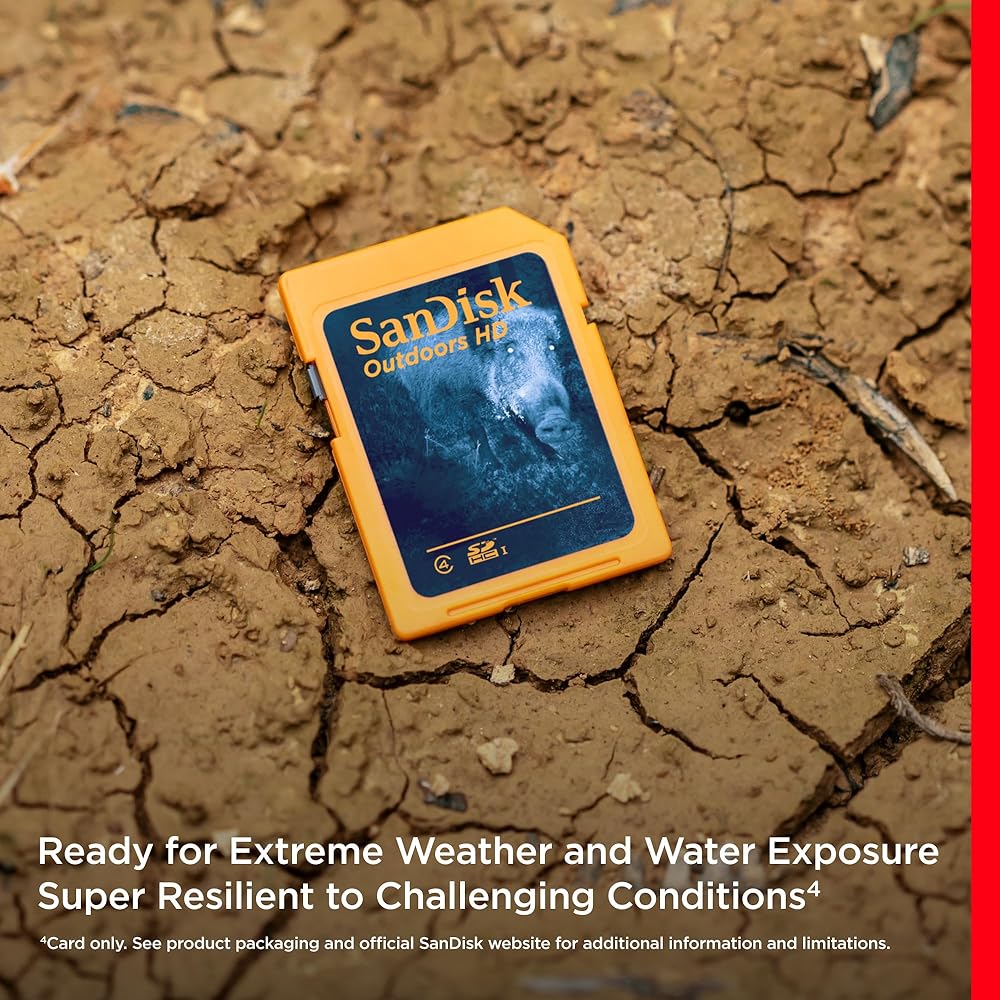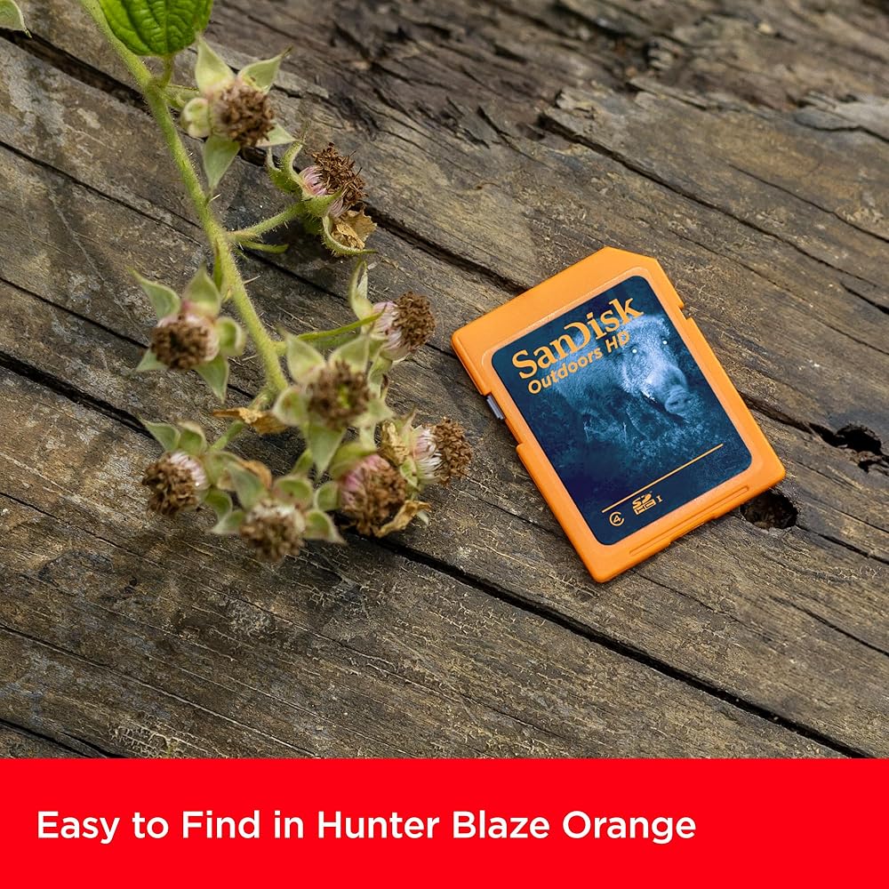 Designed for trail cams and other devices used outside, SanDisk Outdoors HD SDHC UHS-I cards deliver the reliable performance required to capture clear footage. With vivid blaze orange card enclosures, the cards are easy to spot even if dropped face down on the forest floor.