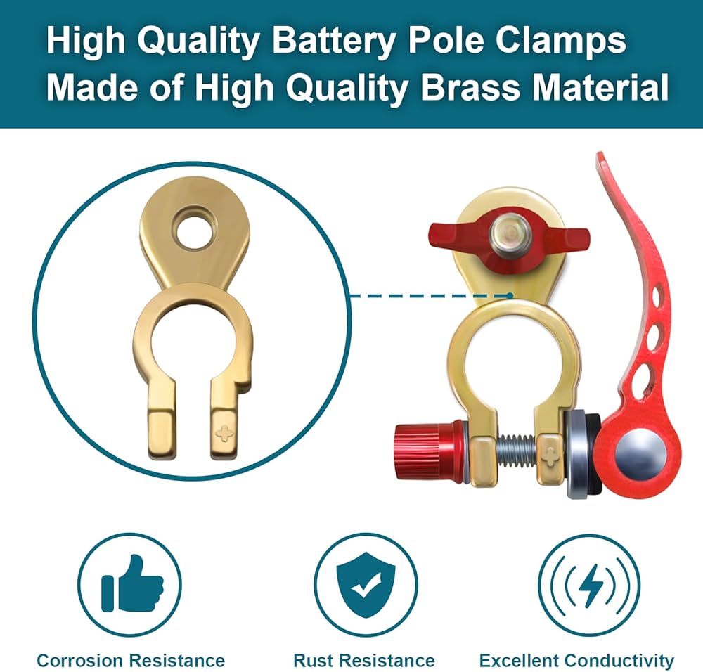 • مادة فاخرة: الموصلات الطرفية لبطارية السيارة ذات العمود الواحد مصنوعة من مادة النحاس والفولاذ عالية الجودة وهي مقاومة للتآكل مع موصلية كهربائية ممتازة يمكن أن تقلل من تشويه الجهد الكهربي وفقدان ناقل الحركة.