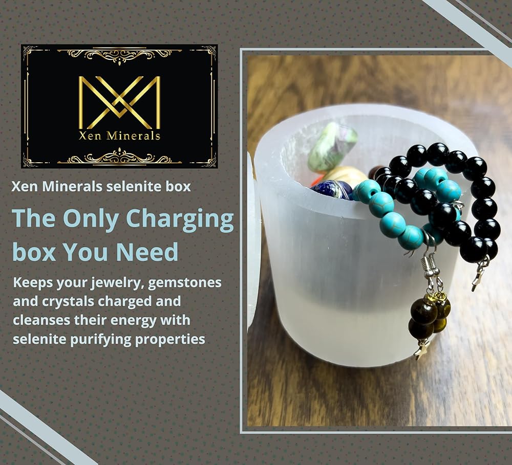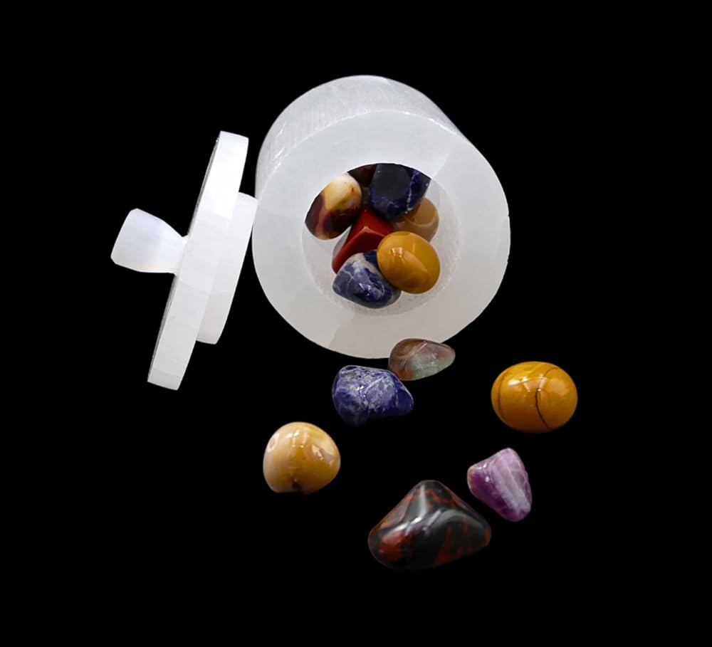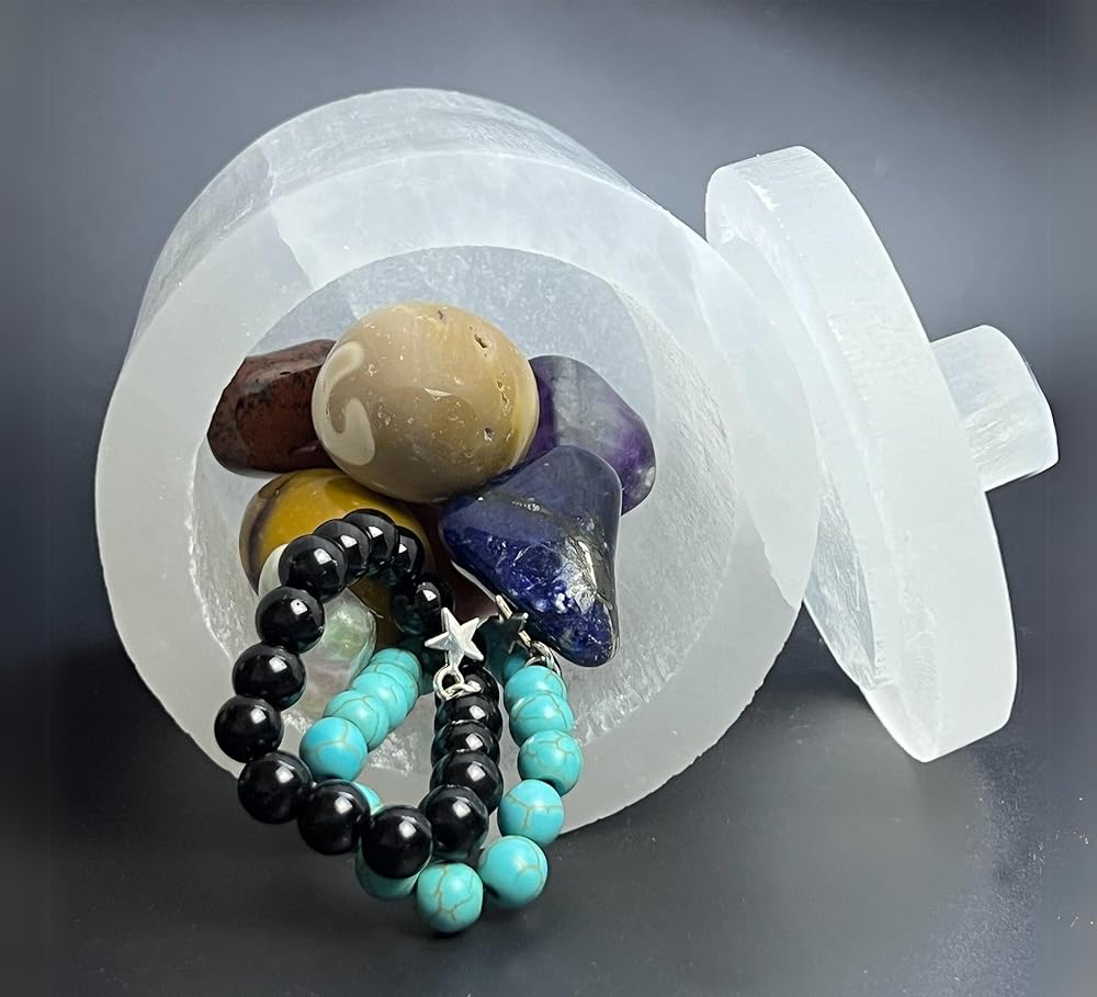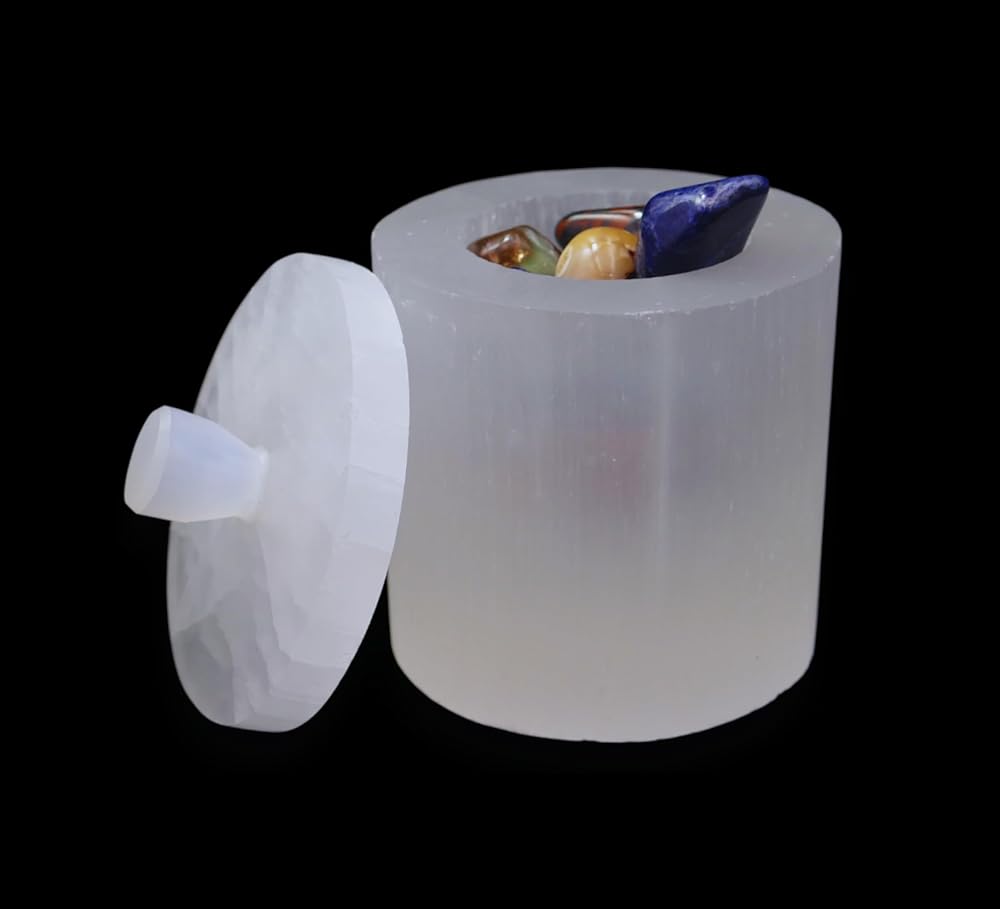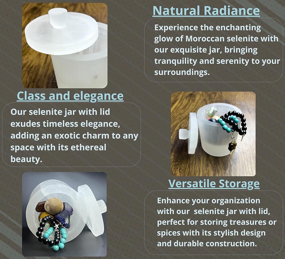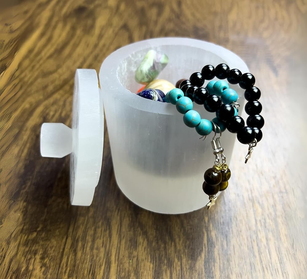perfect for storage : Our selenite Jar with Lid is ideal for storing your jewelry and gemstones keeping them charged and cleansing them for negativity and bad energy.