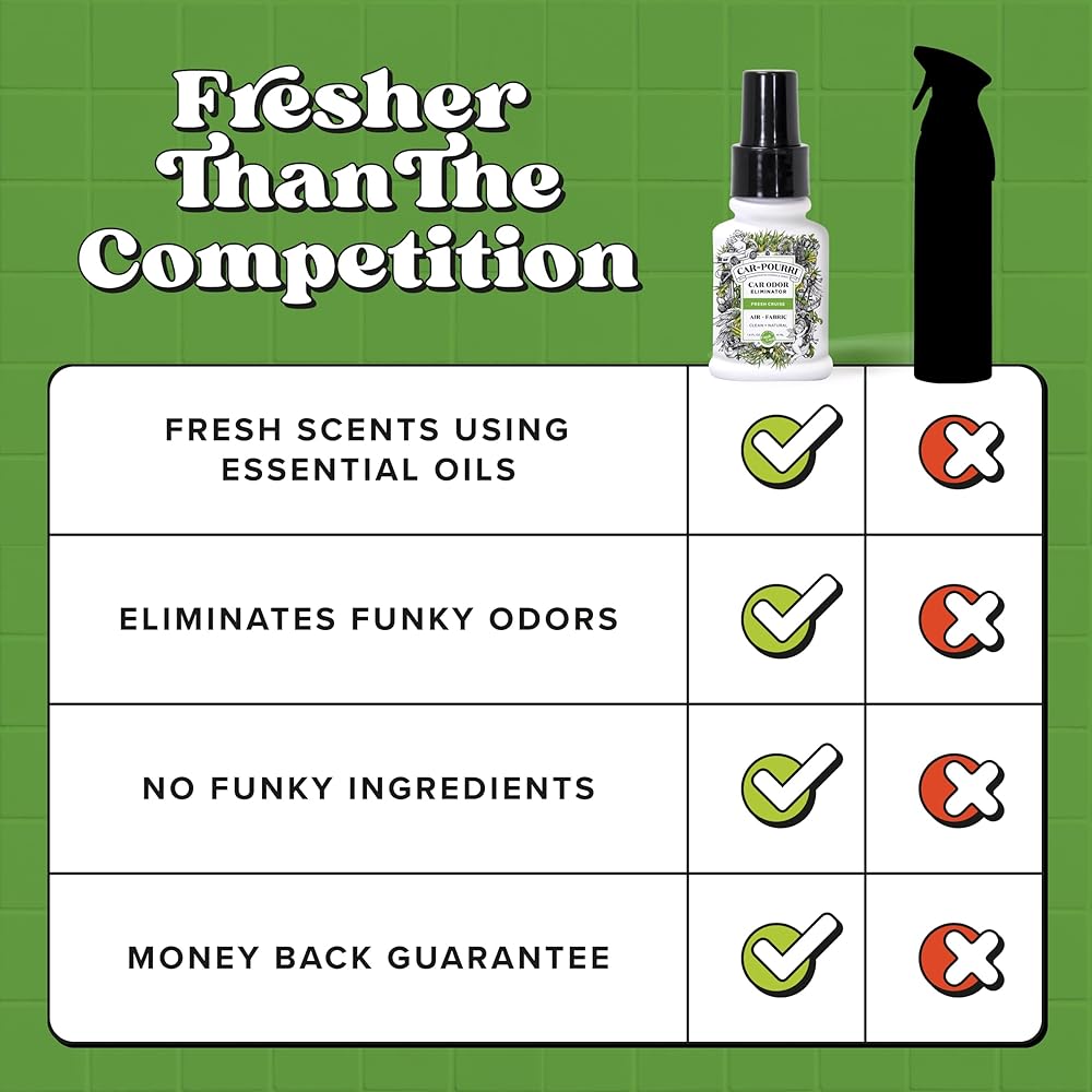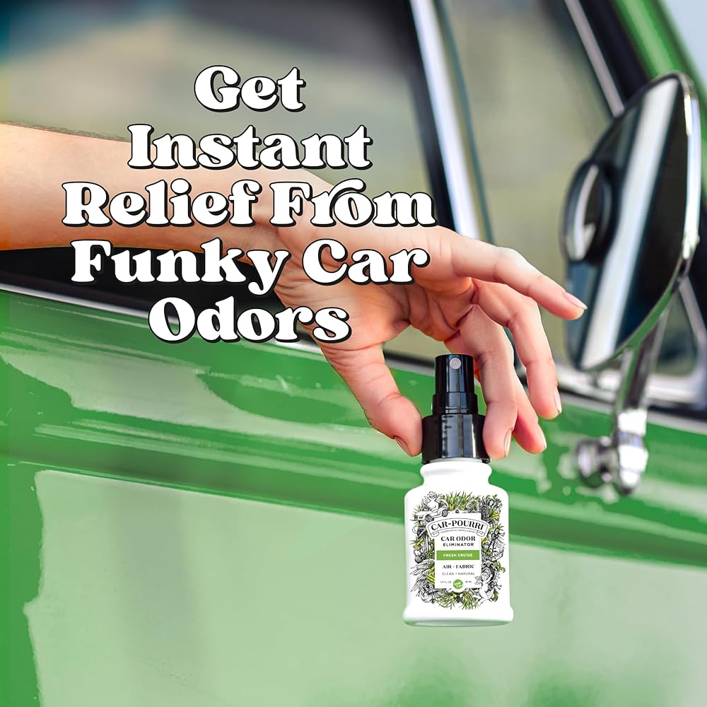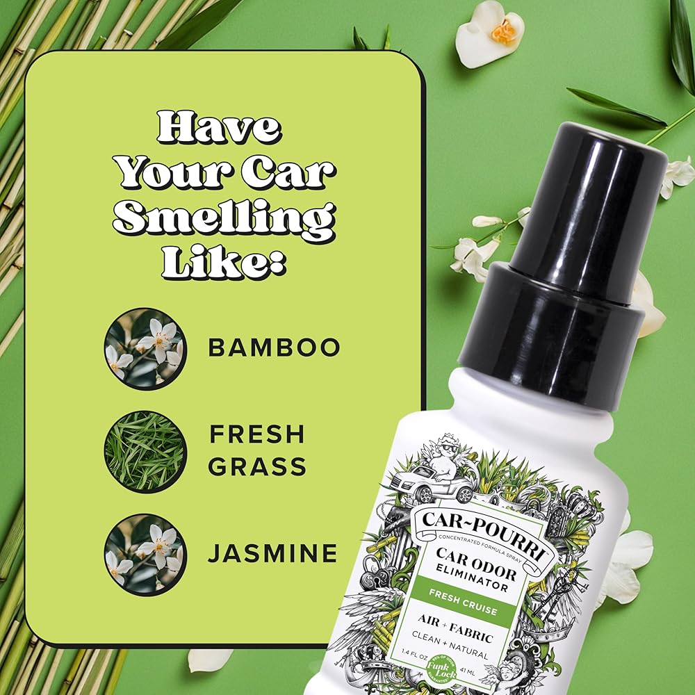 • Smell ya later! Leave funky fumes in the dust every time you put the pedal to the metal. Car Pourri instantly refreshes stinky surfaces in your car with the scent of a fresh cruise (jasmine + bamboo + fresh grass). Eliminates odors (including smoke) in air & on fabric - 100% guaranteed!