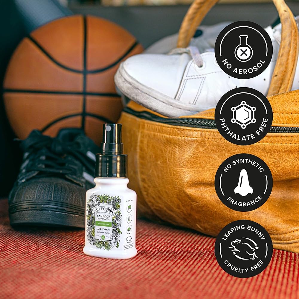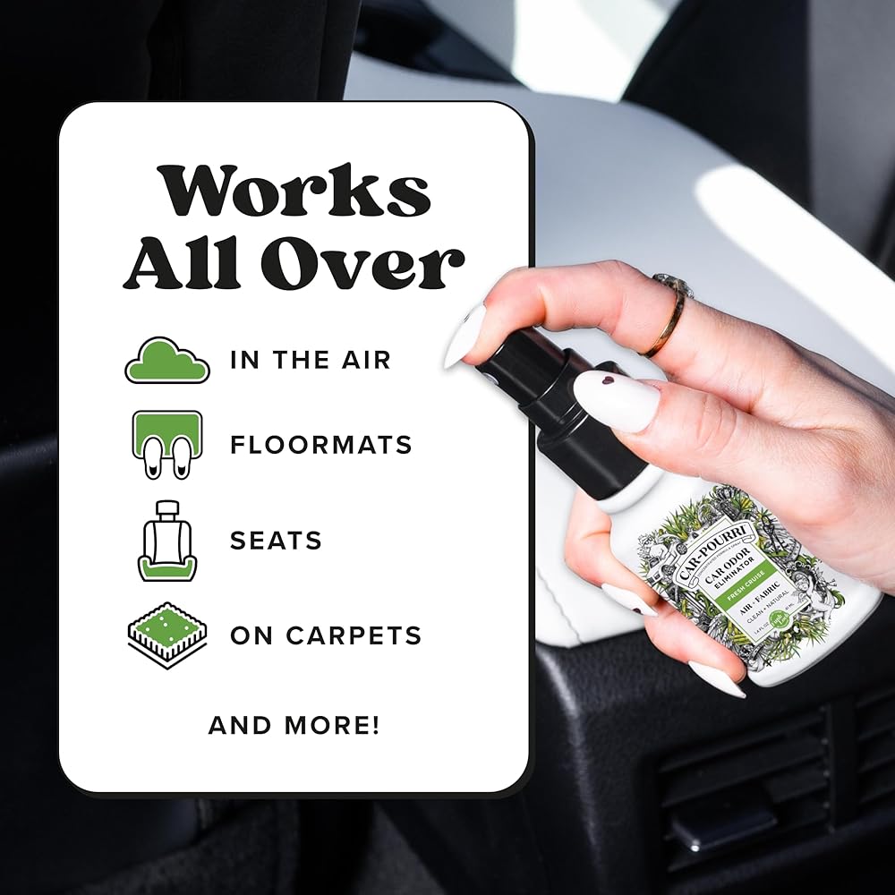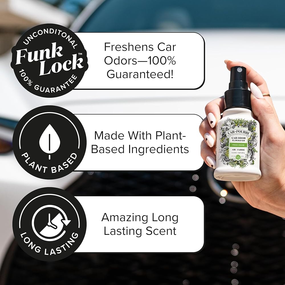 Eliminate the funk, don't mask it! Car Pourri refreshes any stinky surface in your car. Like, for real. Proprietary natural Funk Lock Technology neutralizes odor molecules so they never reach your nose. Car Pourri naturally eliminates odor entirely and leaves your ride smelling better than you found it– guaranteed. Simply spritz 3-5 sprays on any stinky surface in your car or into the air.