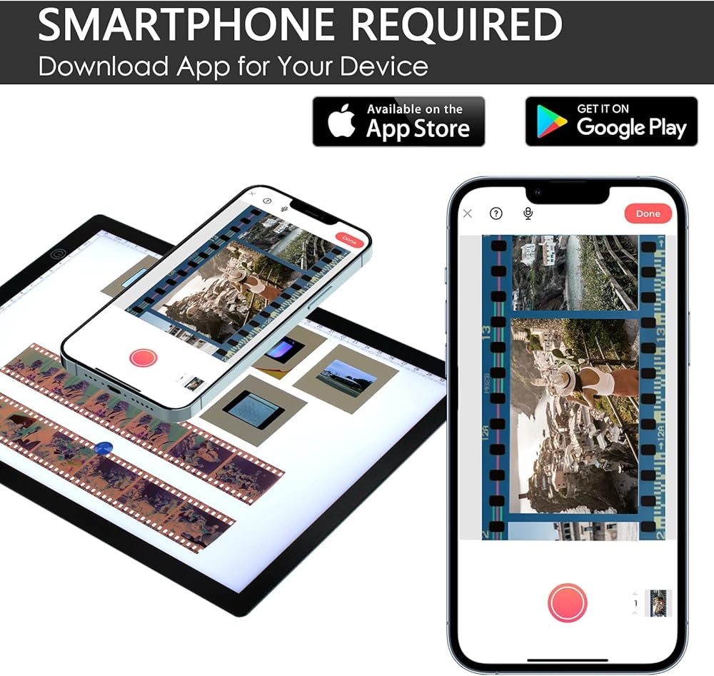 Download SlideScan app (for scanning slides) and FilmBox app (for scanning negatives) to scan slides and negatives and convert them to digital images. APP allows edit photos and share on social media.