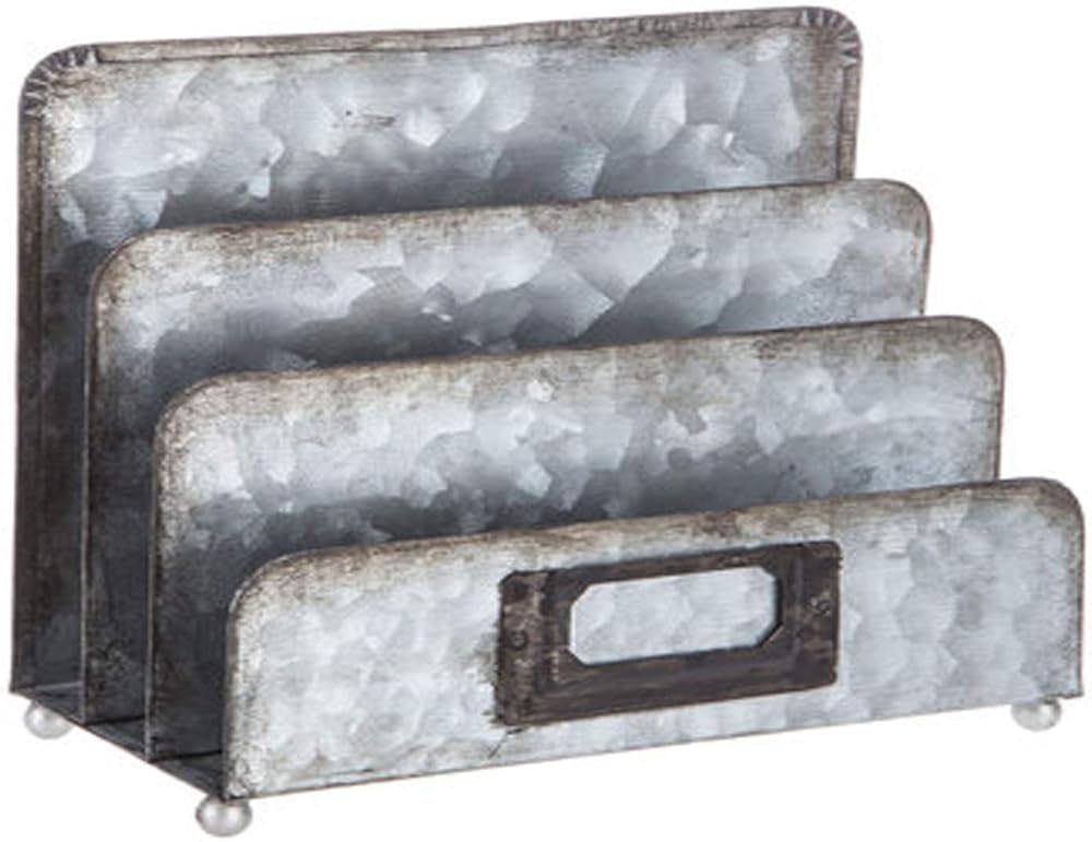 Stay organized without abandoning your incredible, rustic style with Galvanized Metal File Organizer. This adorable table piece features three separations intended to organize papers and notes. The galvanized metal features rust-colored distressing for a fantastic, farmhouse finish.