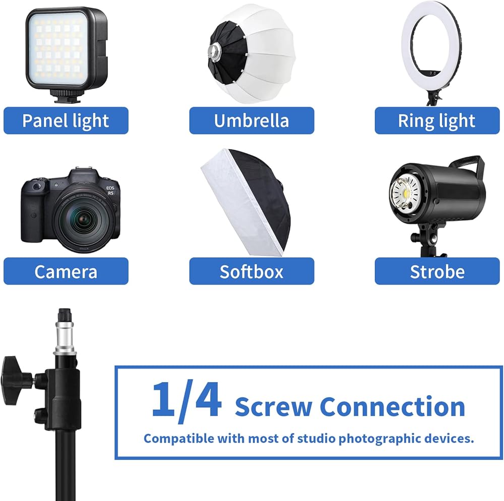🎥[قابل للتطبيق على نطاق واسع]: حامل إضاءة للتصوير الفوتوغرافي، يمكن استخدام طرف لولبي ملولب 1/4 بوصة لالتقاط الصور، وتثبيت الأضواء القوية، والمظلات، والصناديق الناعمة وغيرها من معدات التصوير الفوتوغرافي. يمكن استخدام حوامل ترايبود في الاستوديو وفي الموقع.