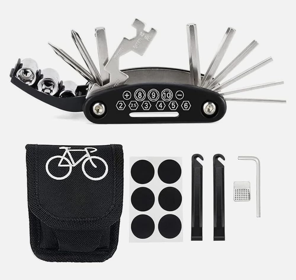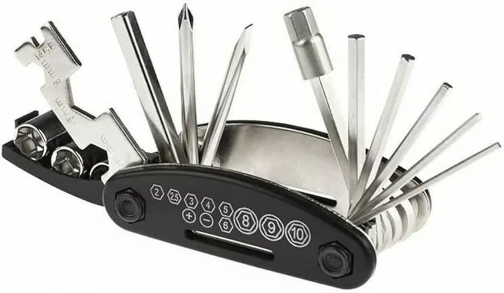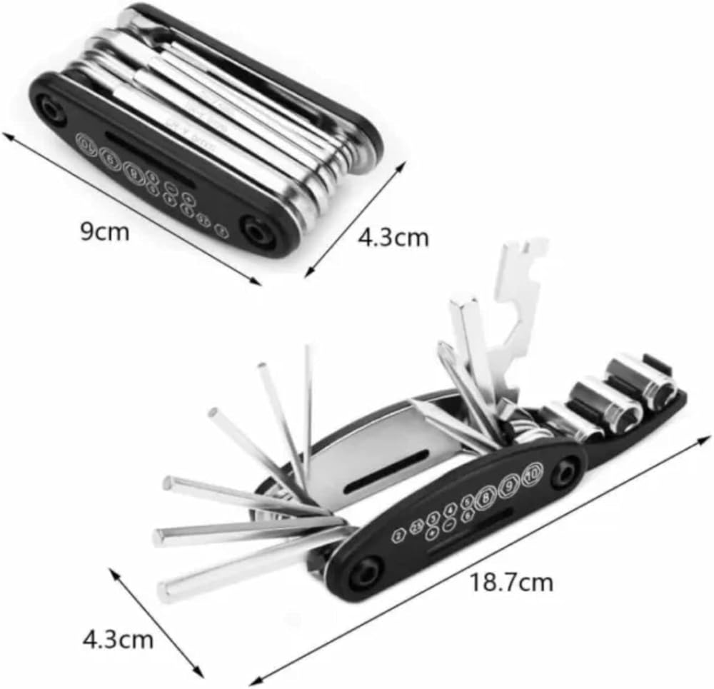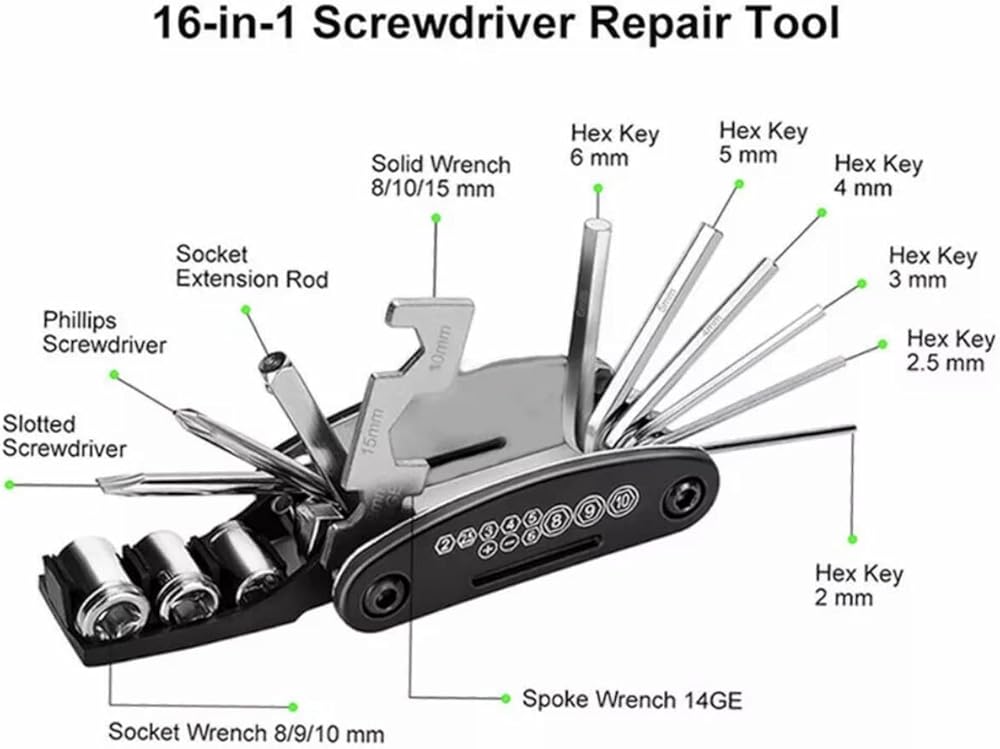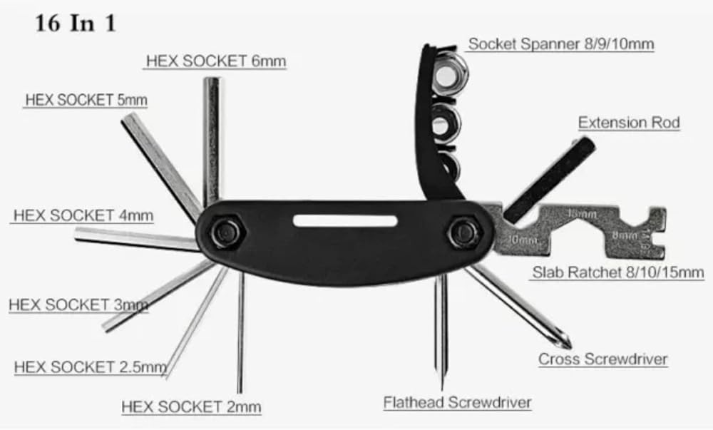 16 in 1 Repair Tool Kit: - Socket Wrench: 8/9/10 mm - Allen Wrench: 2/2.5/3/4/5/6 mm - Slot type screwdriver - Phillips screwdriver - Socket extension rod - Flat wrench 8/10/15 mm - Inner hexagon spanner 3/4/5/2/2.5/6 mm - Spoke wrench