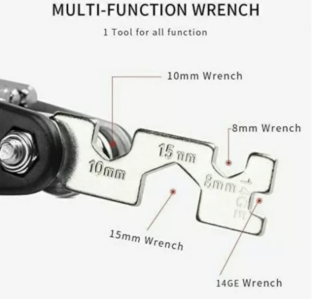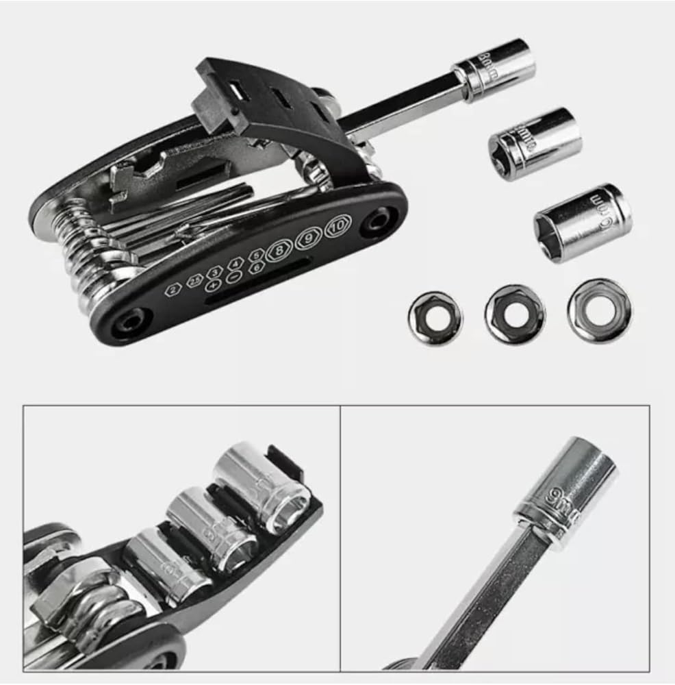 Full Multi-function kits: all in one tool with Socket Hex Wrench 8/9/10/mm,S lotted Screwdriver, Phillips Screwdriver, Socket Extension Rod, Solid Wrench 8/10/15/mm, Hex Key Wrench 2/2.5/3/4/5/6mm, Spoke Wrench