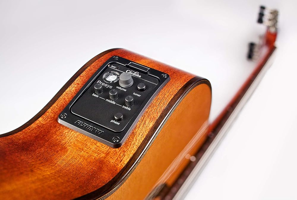 The 12 Natural has 12 frets to the body, allowing the bridge to sit further back on the soundboard, where resonance is optimized for a large sound with long sustainesys electronics