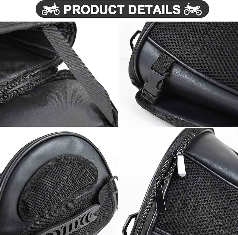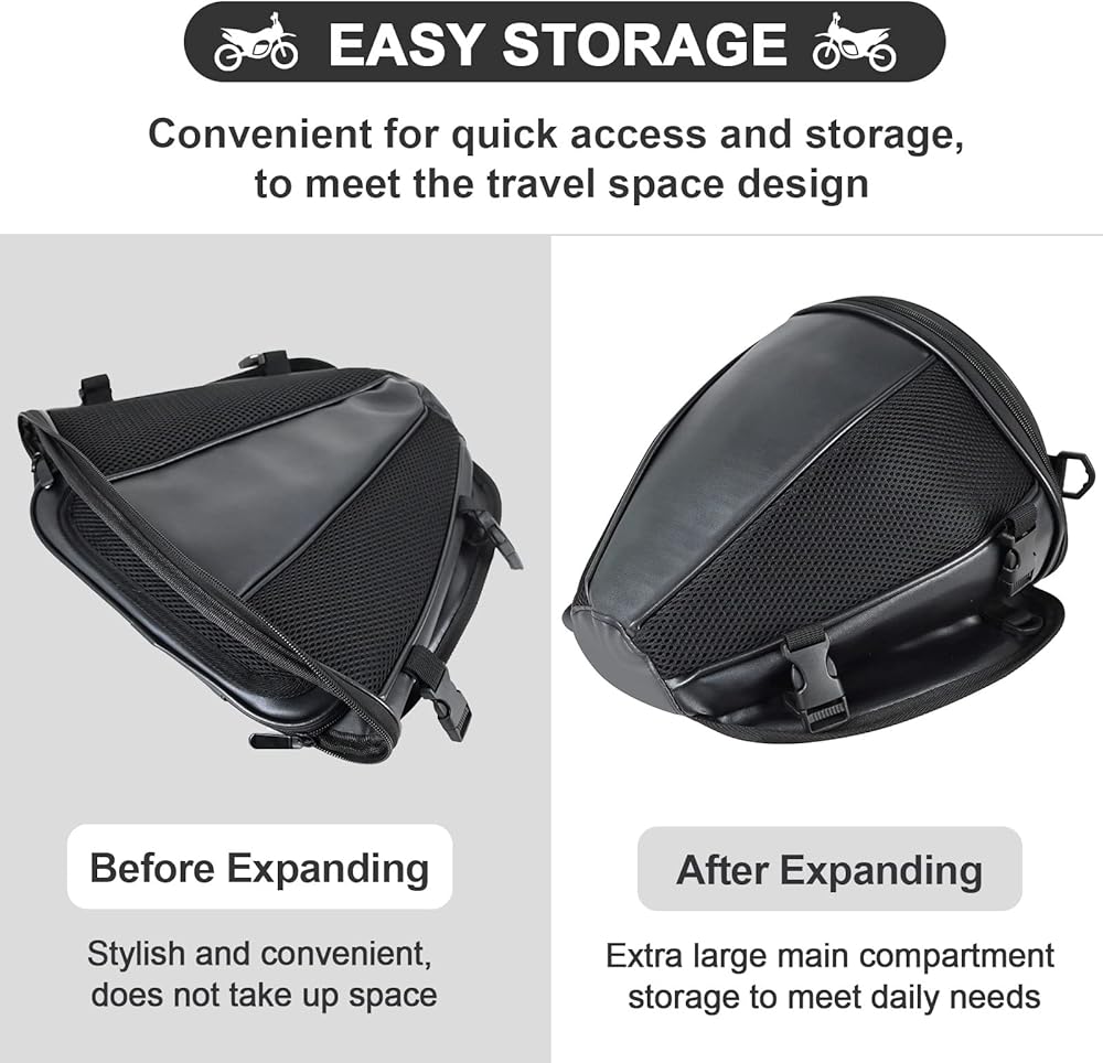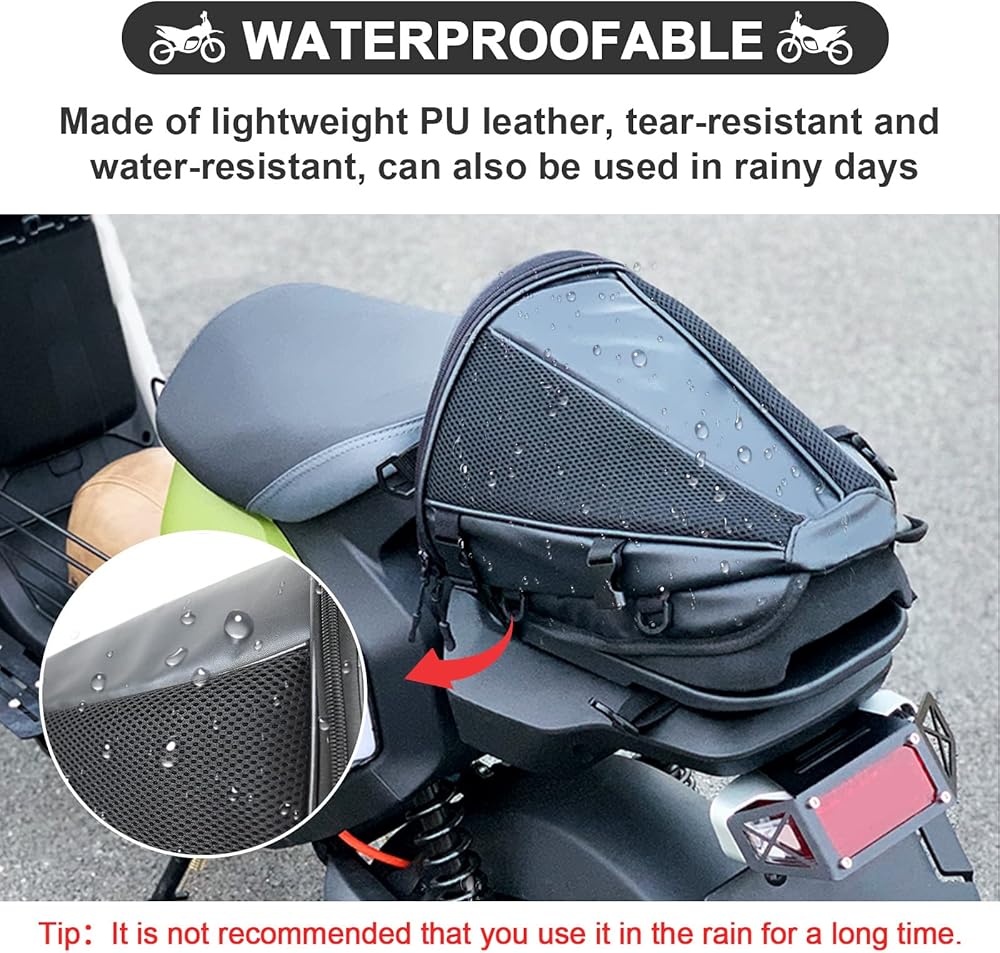 【جودة عالية】حقيبة سرج للمقعد الخلفي للدراجة النارية خفيفة للغاية ومتينة. مصنوع من جلد البولي يوريثان الخفيف للغاية وهو مقاوم للتمزق ومقاوم للماء، ويحافظ على أغراضك جافة أثناء القيادة الممطرة. تصميم مقاوم للماء، يمكنك استخدامه في الأيام الممطرة (ولكن ليس مناسبًا للاستخدام في المطر الكبير).