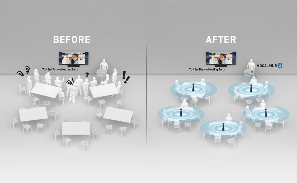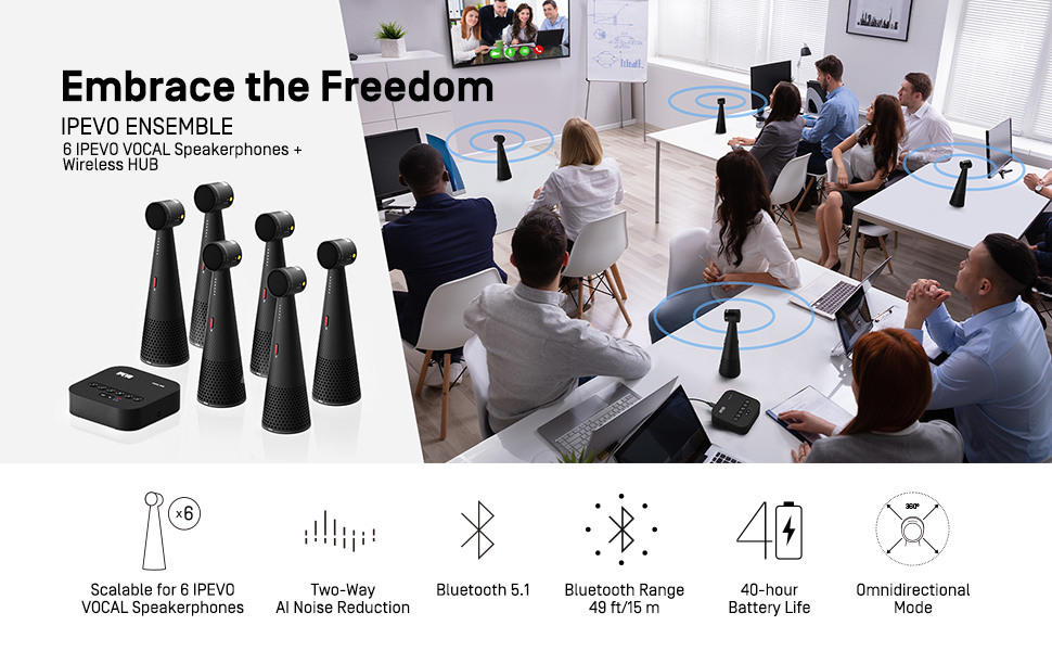 IPEVO VOCAL HUB wireless audio system revolutionizes conference audio by addressing challenges such as complex wiring, large rooms, scattered conference table arrangements, and changing meeting setups. VOCAL HUB wirelessly pairs with up to 6 IPEVO VOCALs, providing synchronized audio with 2-way AI noise reduction technology.