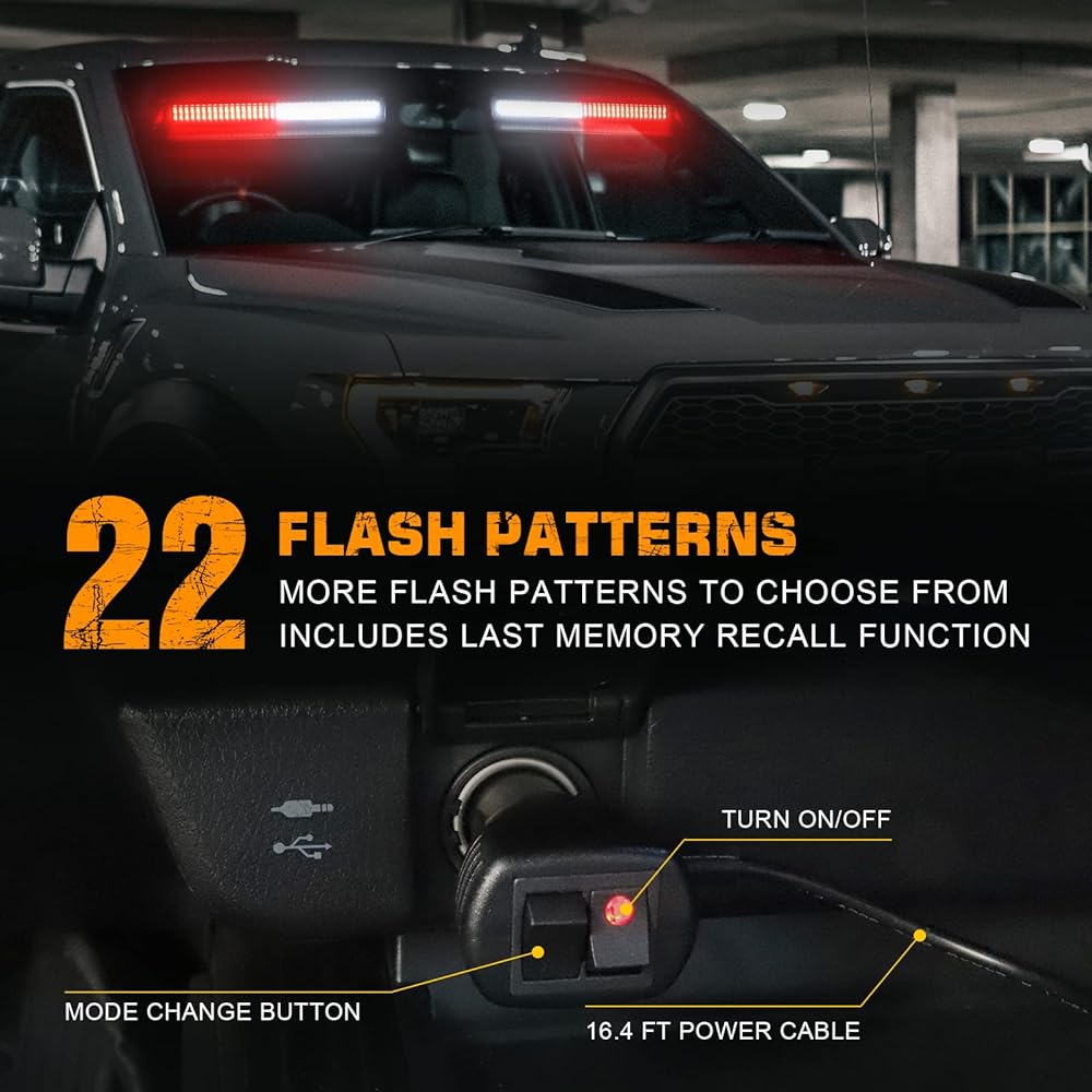 [تشغيل سهل] أضواء الطوارئ القوية هذه تصميم مريح بمفتاح مزدوج. قابس سجائر 12 فولت، سهولة الوصول إلى التشغيل/الإيقاف ومفتاح تغيير الوضع. يتضمن 22 نمطًا مختلفًا للفلاش يمكنك الاختيار من بينها واستدعاء الذاكرة في الوضع الأخير.