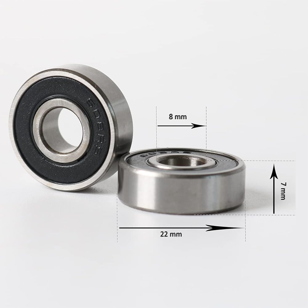 - -الحجم: 608 محمل لوح التزلج 8 × 22 × 7 مم، المعرف = 0.31 بوصة/ 8 مم؛ القطر الخارجي = 0.87 بوصة/ 22 مم؛ السُمك = 0.28 بوصة/ 7 مم