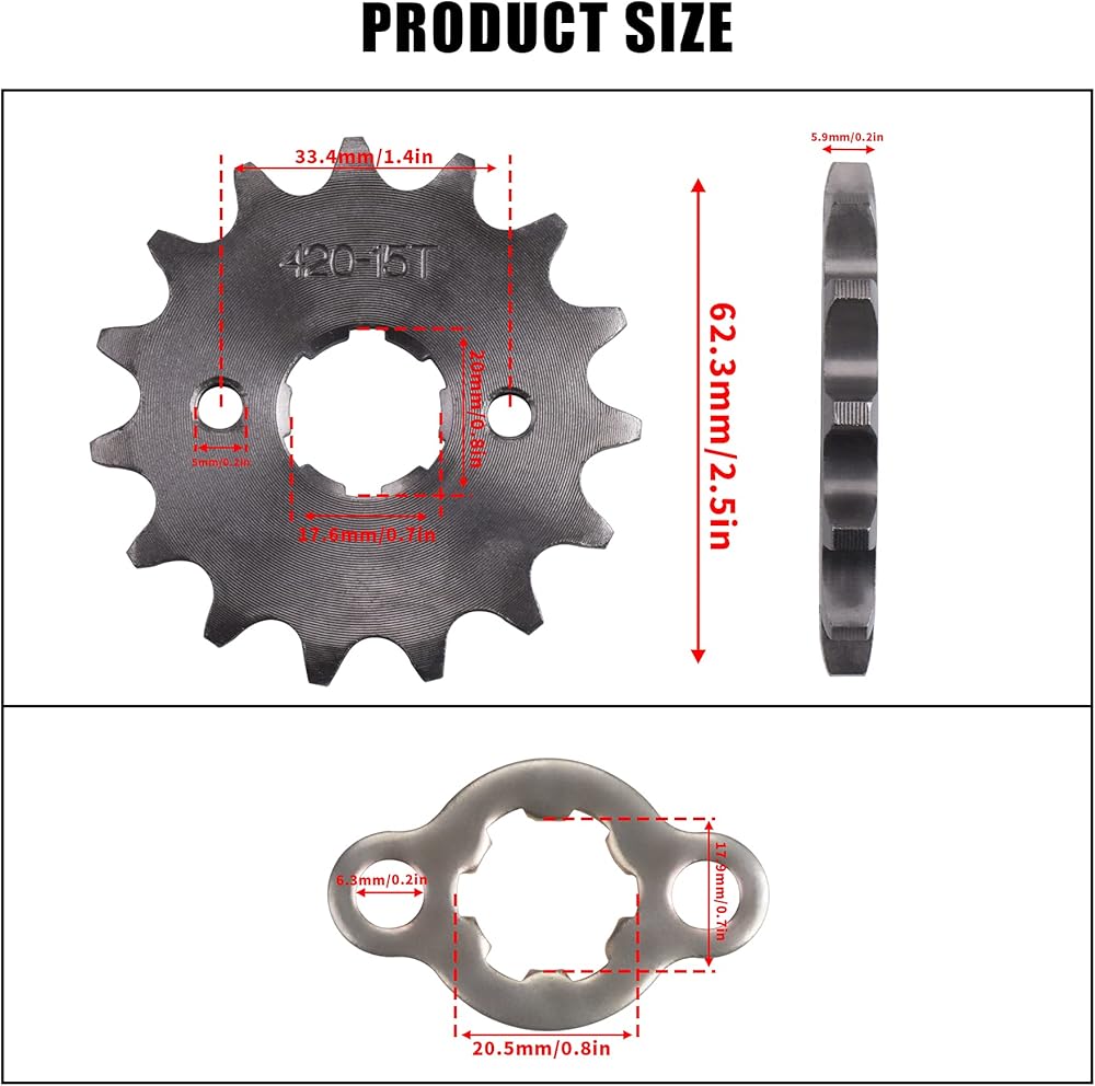 • الحجم: العجلة المسننة الأمامية 420 15 سنًا 20 مم؛ المسافة بين فتحات التثبيت: 34 مم/1.3 بوصة؛ القطر الداخلي للترس: 18 مم/0.71 بوصة (كما تظهر الصورة)