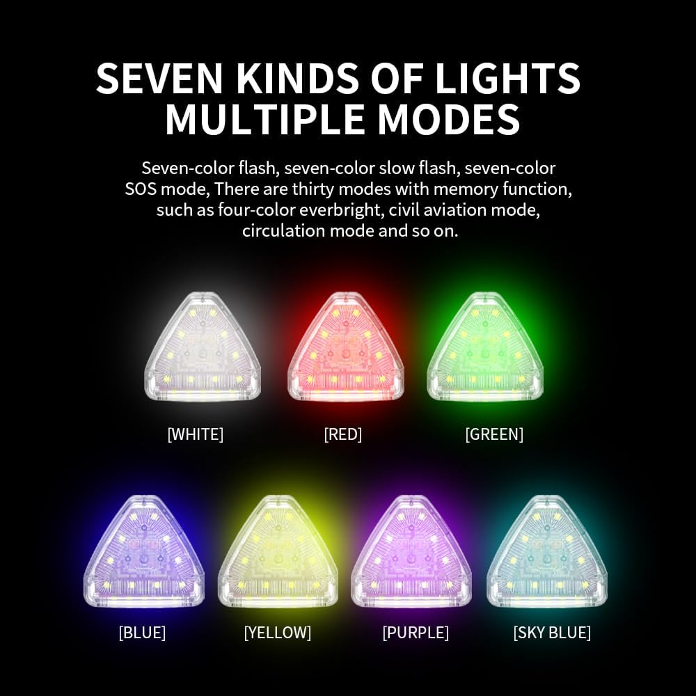 • 【7 ألوان و7 أوضاع إضاءة】يمكن تبديل 7 ألوان LED، و7 ألوان للتحكم عن بعد، والتي يمكن أن تضيف ضوء أبيض لجو السيارة/ضوء أحمر/ضوء أخضر أزرق فاتح، ضوء أصفر، ضوء أرجواني/أزرق جليدي، تعديل الوضع. : دورة وامض/دورة فلاش بطيء/فلاش سريع/فلاش بطيء/ضوء ثابت/وضع الطيران المدني.