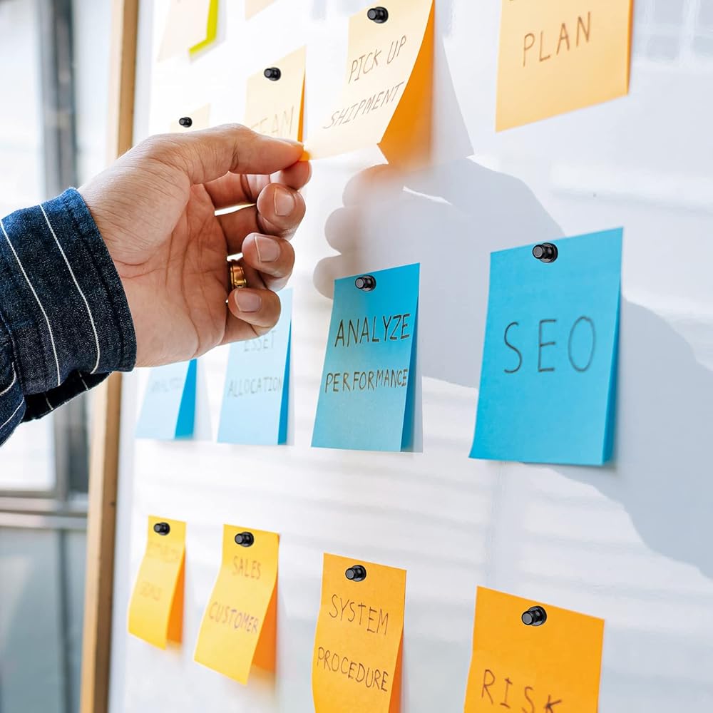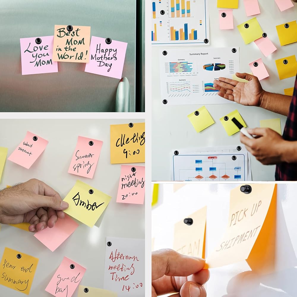 PREMIUM MAGNETISM: Each powerful magnet holds up to 11 sheets of paper on any metallic surface. No more sliding papers with cheap magnets. These push pin magnets are tiny too so they won't cover up exact things you want to display.