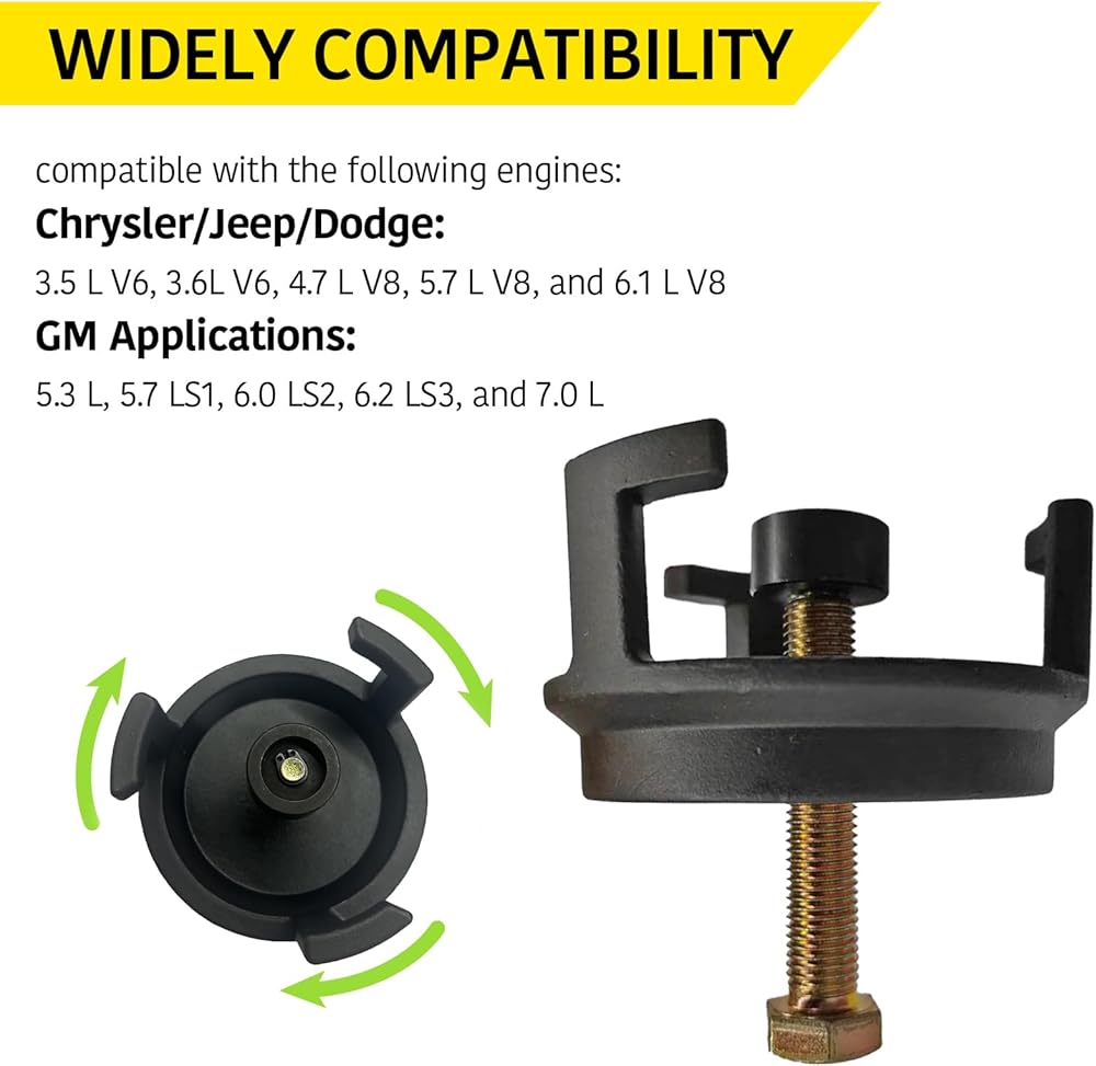 【Widely Compatibility】This harmonic balancer puller is compatible with the following engines: GM Applications: 5.3 L, 5.7 LS1, 6.0 LS2, 6.2 LS3, and 7.0 L Jeep/Dodge: 3.5 L V6, 3.6L V6, 4.7 L V8, 5.7 L V8, and 6.1 L V8.